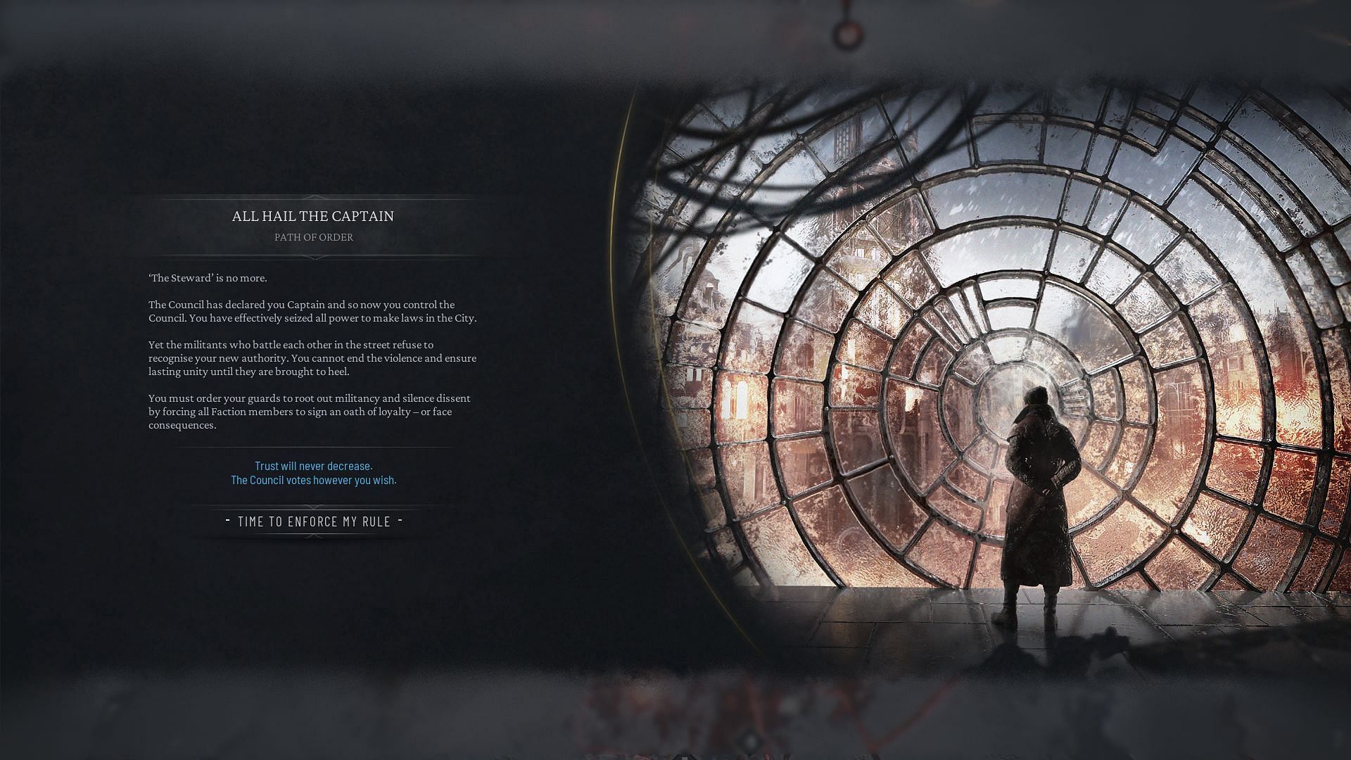 Once the rule is enforced, Trust becomes permanent in the City and all rights are taken away. Protestors and rioters and dealt with most stringently and gradually, and the Tension in your City reduces to nothing. Captain's Authority grants you the final say in the City and nothing can waver your position now. Wait for Secure Your Rule to be completed.