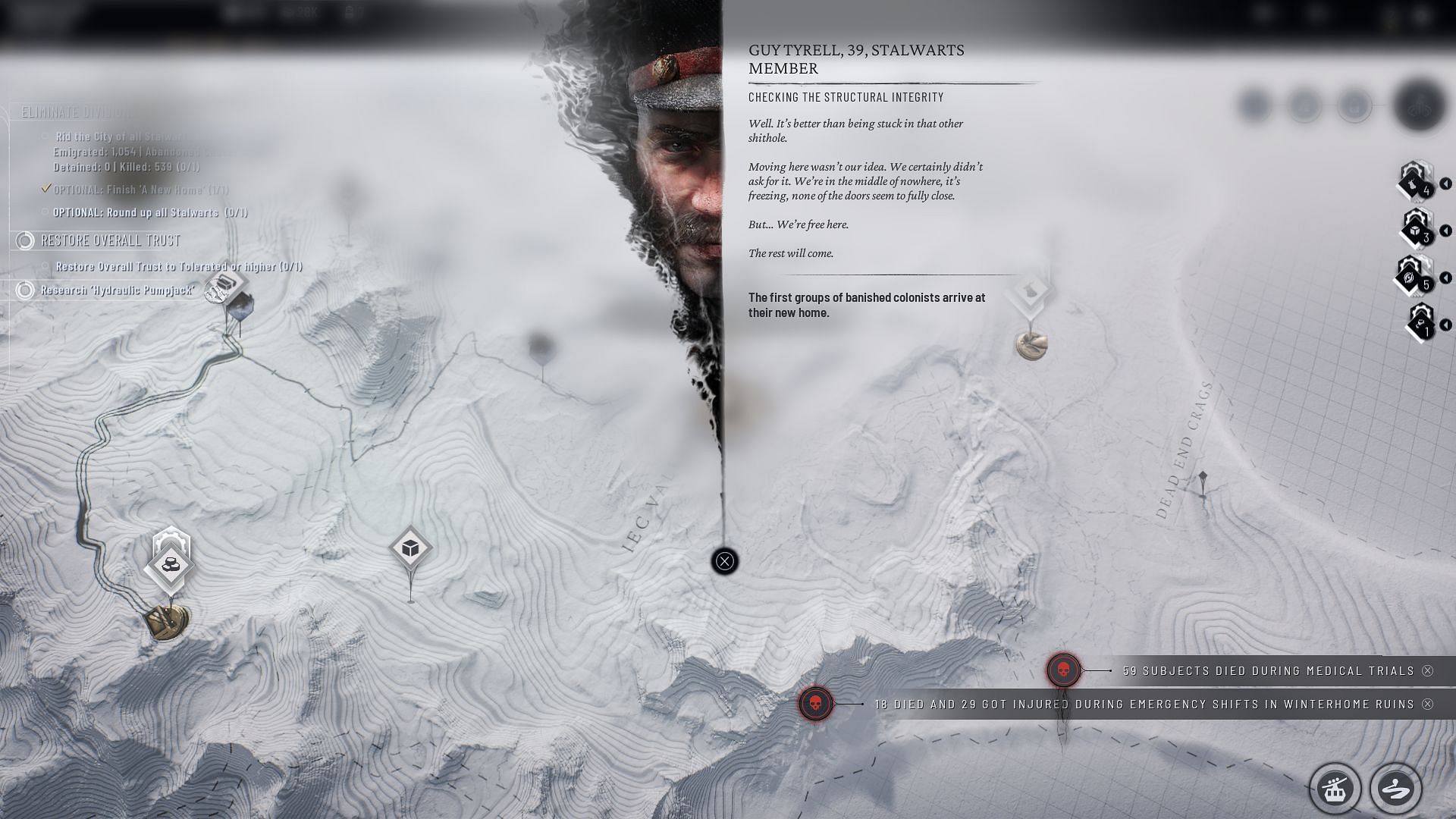 If you choose to banish the Opposing Faction in Frostpunk 2, you must evacuate them from the City by resolution or force. You will have a counter displayed on the left of your screen that depicts the affected Faction population that you must remove before you can reach endgame.
