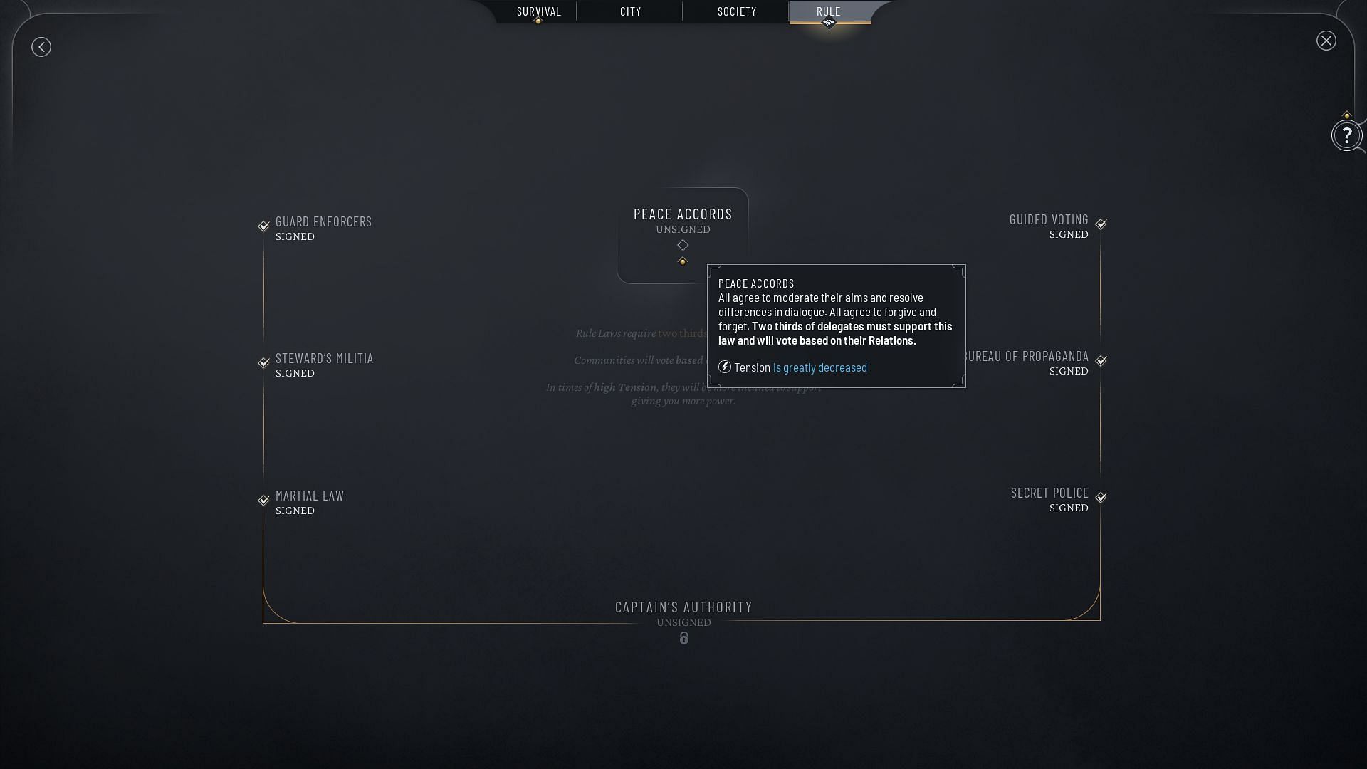 Once you have chosen two actions for both Factions, you must complete these at the earliest. The more you delay, the more your Trust falls and pushes you to the brink of the City's collapse and your banishment to the Frostlands. After completing the actions, head over to the Council and then to the Rule tab. You will find Peace Accords at the center of the screen. Select and propose the Law to be voted on.