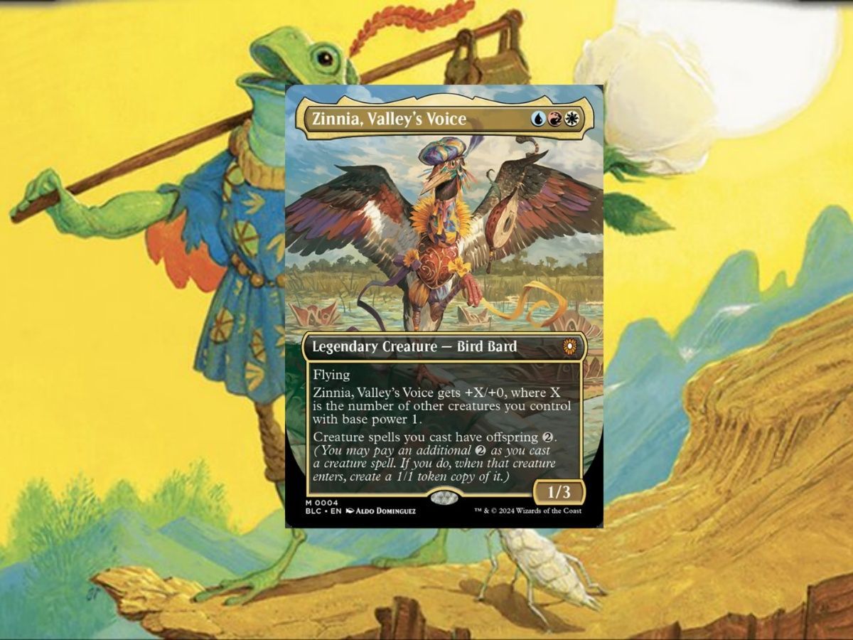 The star of the Red/White/Blue Commander Precon Zinnia, Valley’s Voice is one of my absolute favorite MTG Bloomburrow cards. It gives all creatures you cast Offspring 2. That means, no matter what creature you cast, whether Eldrazi, Titan, God, or Fox, you can pay 2 colorless to make a 1/1 copy of it, so you get even more amazing ETB triggers. That’s why this card is so great.