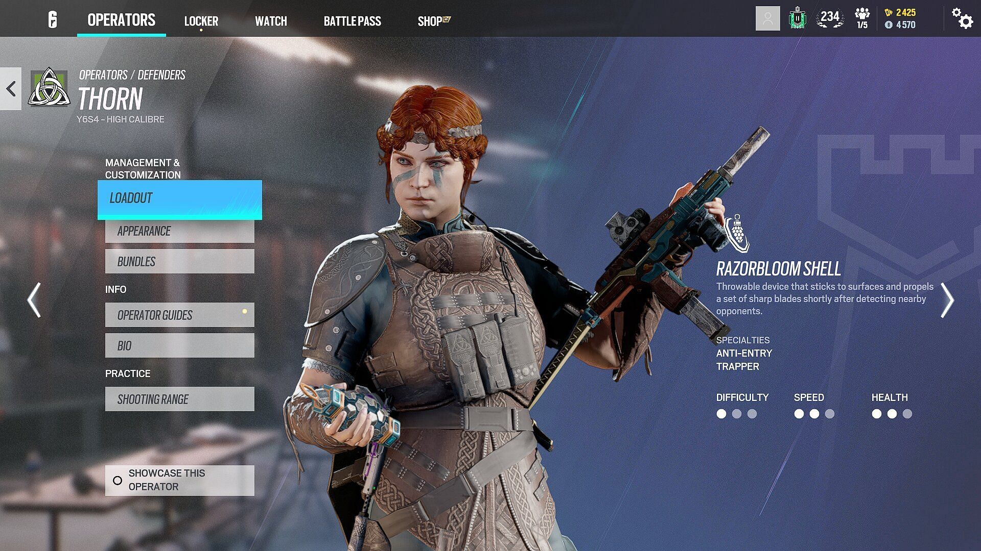 Thorn is a trapper who can utilize her primary gadget, Razerbloom shells to get intel on the attacker's presence and potentially eliminate them if these mines trigger in lethal ranges. Thorn can lock down stairways like House-Stairs, Kitchen-Stairs, and Back-Stairs alongside other entry points across all bombsites.
