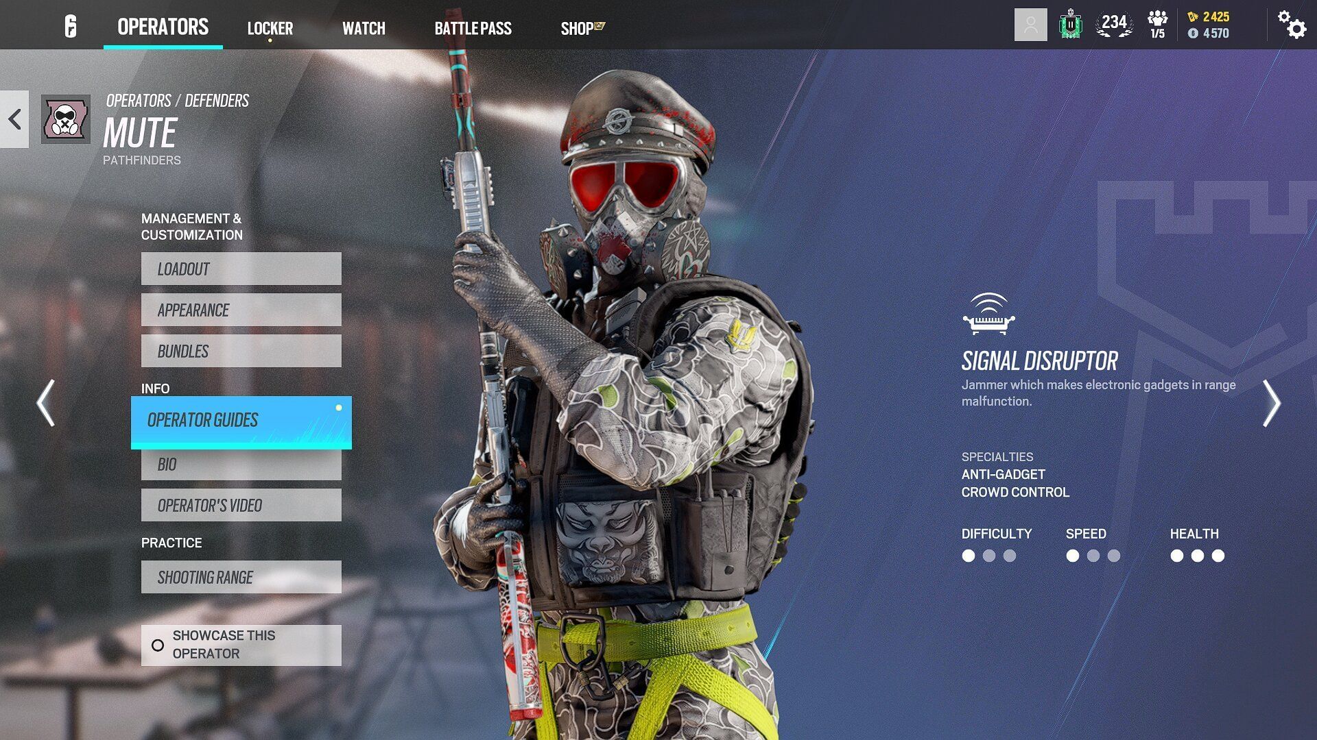 Mute brings one of Rainbow Six Siege's top shotguns, M590A1 as his primary, which allows him to make rotates, and lines of sight, and contest attackers in close ranges. His secondary SMG-11 allows him to take gunfights across medium ranges. He also brings a Nitro cell, which can be utilized to deny attacker gadgets or used offensively in anti-vertical scenarios.