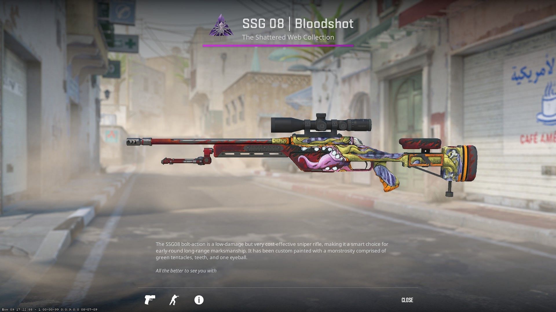 This is one of the most unique Scout skins on the market. With a fearsome shark as the focal point of the SSG 08 Blood in the Water's design, the skin makes excellent use of color to divide it into two pieces. The rifle's core section is decorated with a realistic image of a shark with an open mouth, accompanied by an image of a spreading blood stain.