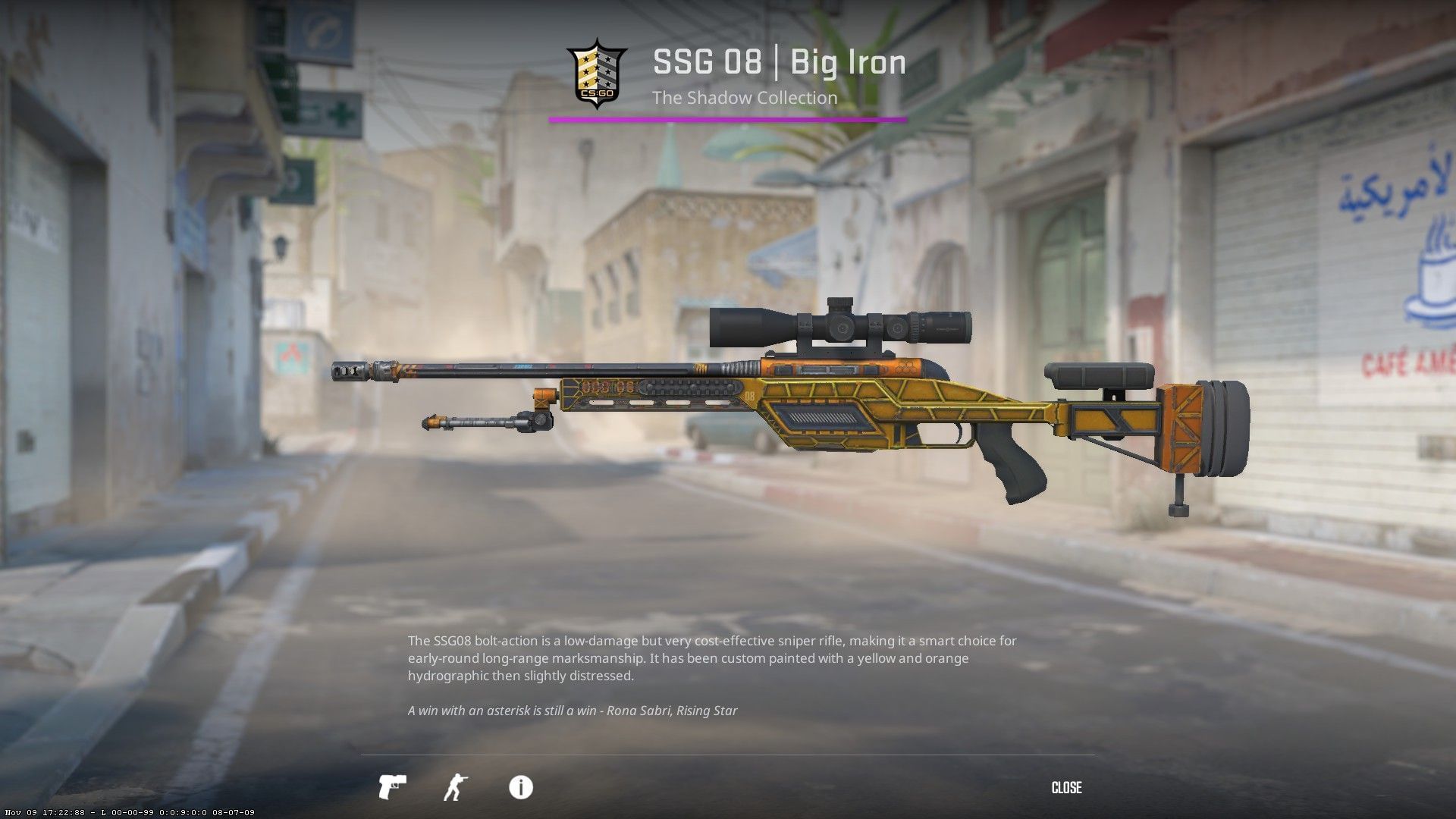For those of you who prefer their skins to be more subtle in Counter-Strike 2, the Big Iron SSG 08 is one with a straightforward design and a blend of futuristic parts put together from scratch. The body of this Scout is covered with metal sheets in yellow color. Individual sections of the weapon are orange and black.
