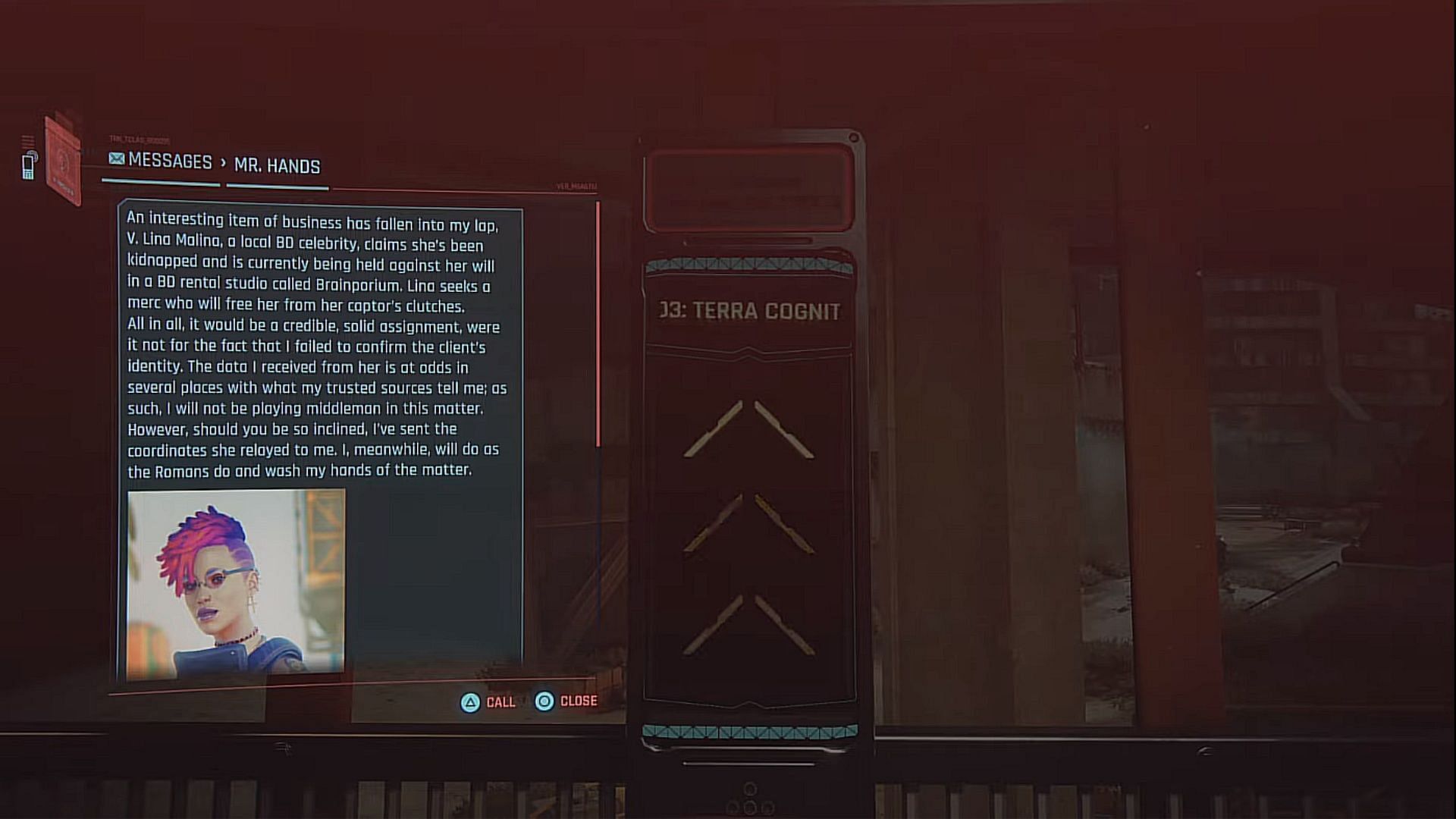 V and Johnny will remark that this job was almost too easy. When you message Mr. Hands, you get two options. We chose that it turns out "Lina" was someone being held prisoner by their business partner. We wiped the partner and let the poor person go free. He wasn’t interested in this at all but suggested V return to work.