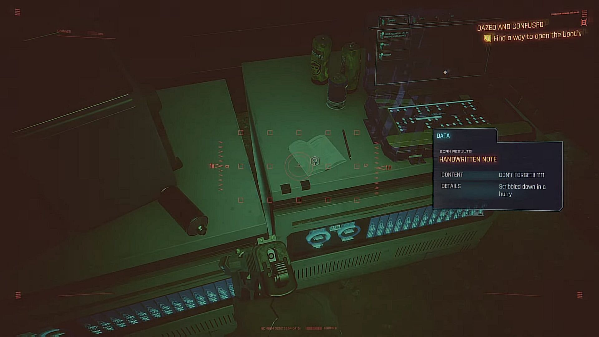 Even after checking the computers, you aren’t going to find any hints to completing Dazed and Confused. The secret is to go into the area upstairs with the computers and scan the "Handwritten note" on one of the tables. It says to not forget "1111." That’s the genius passcode to get into the Braindance stall that this person, who is supposedly Lina Malina, is in.