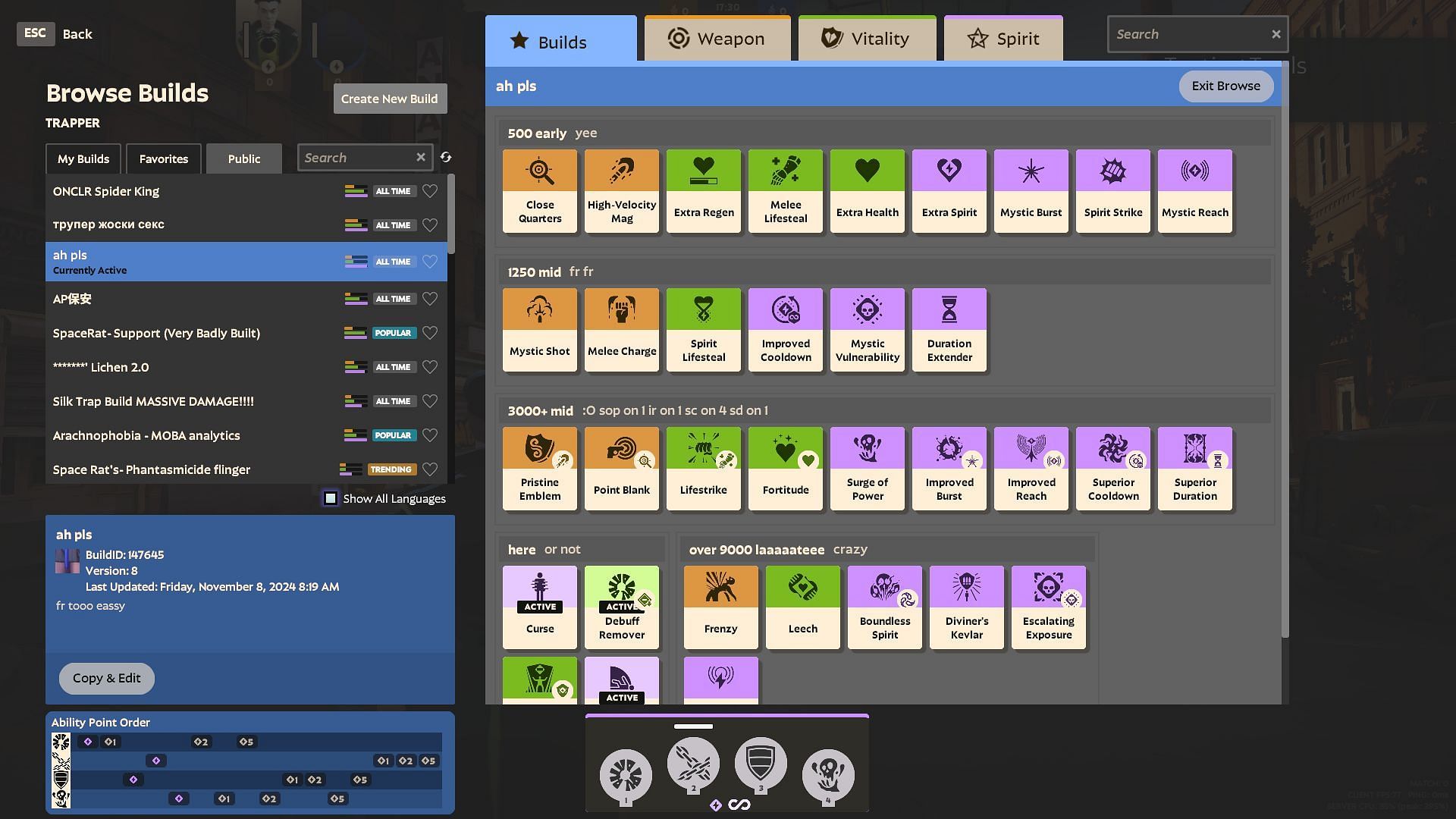 - Crawling Plague: Release a wave of spectral spiders that chase enemies and explode, dealing Spirit Damage. Hit enemies are poisoned, temporarily losing Spirit and Spirit Resist. This effect can stack multiple times.
