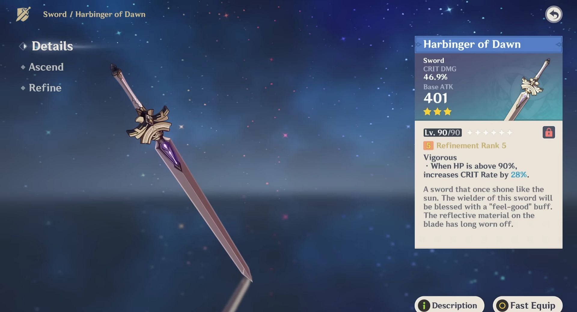 Harbinger of Dawn is one of the best F2P weapons for Chiori in Genshin Impact. While its damage output is not much different from the previous entry, it provides a decent amount of CRIT Rate and CRIT DMG Bonuses, making it a slightly better option. Additionally, it is a 3-star Sword that is easily accessible.