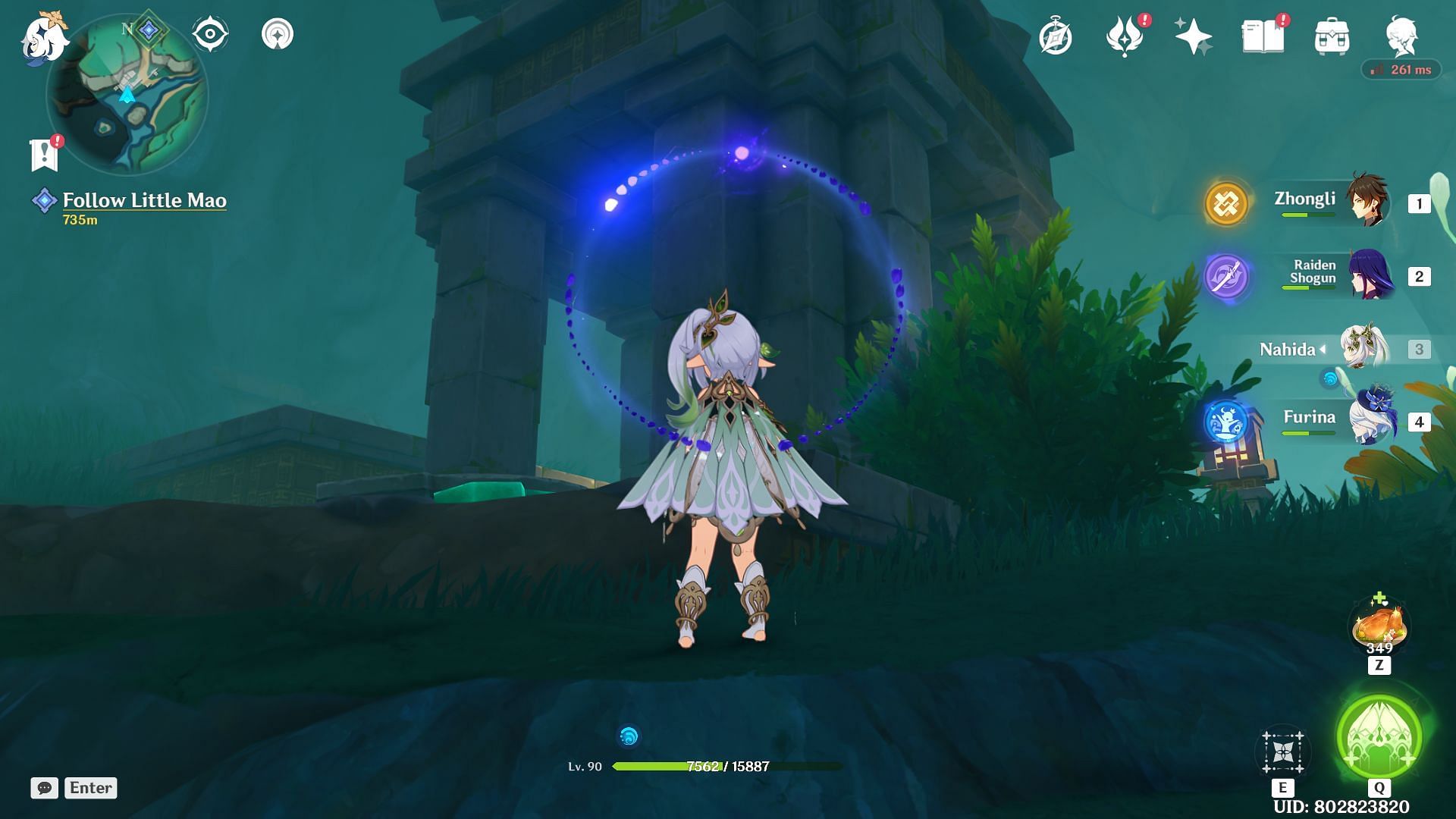 Collect the pillar from inside and head opposite the first pillar, towards the green node at the base of the stairs. Place it on top of the green node, and collect the first pillar to place it on a second node located on top of the stairs. This will unlock a new gate with a half Jade ring inside. Break the destructible stone to collect it.