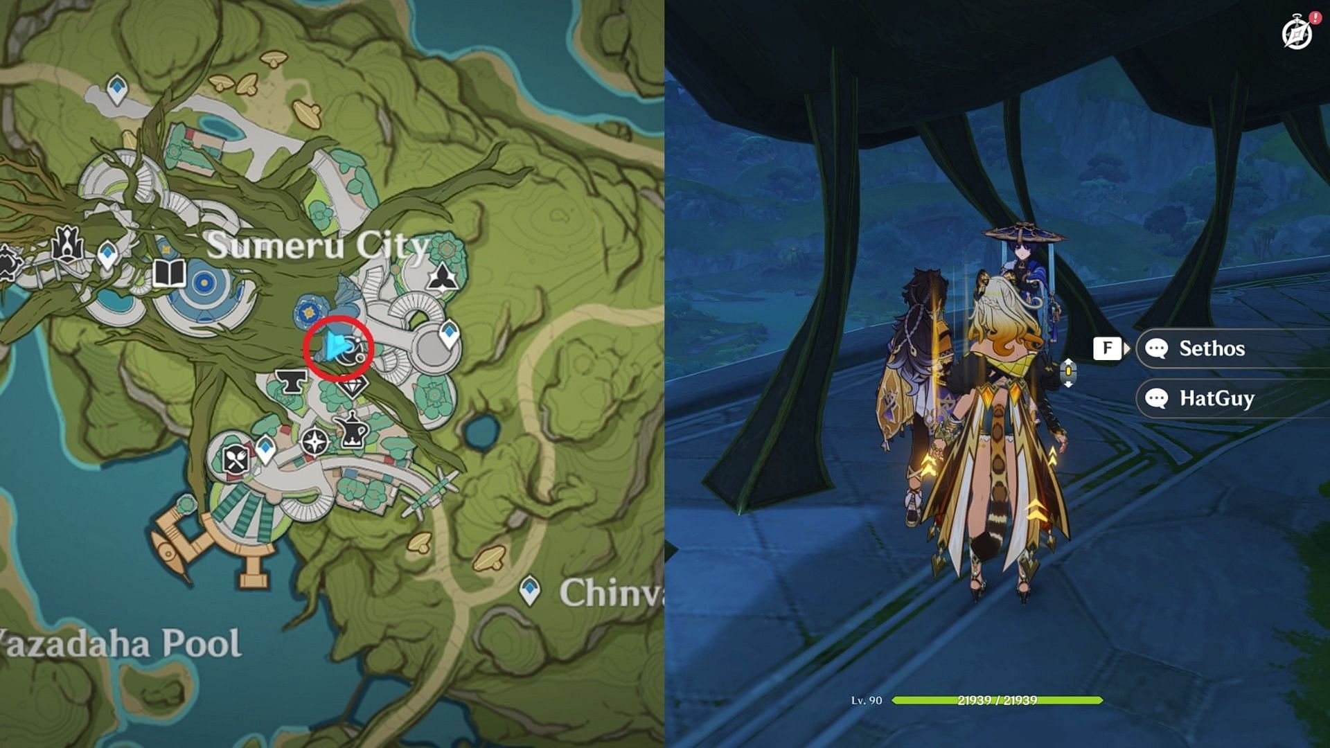 Teleport to the eastern waypoint in Sumeru City and head straight to find Nahida in the Sanctuary of Surasthana.