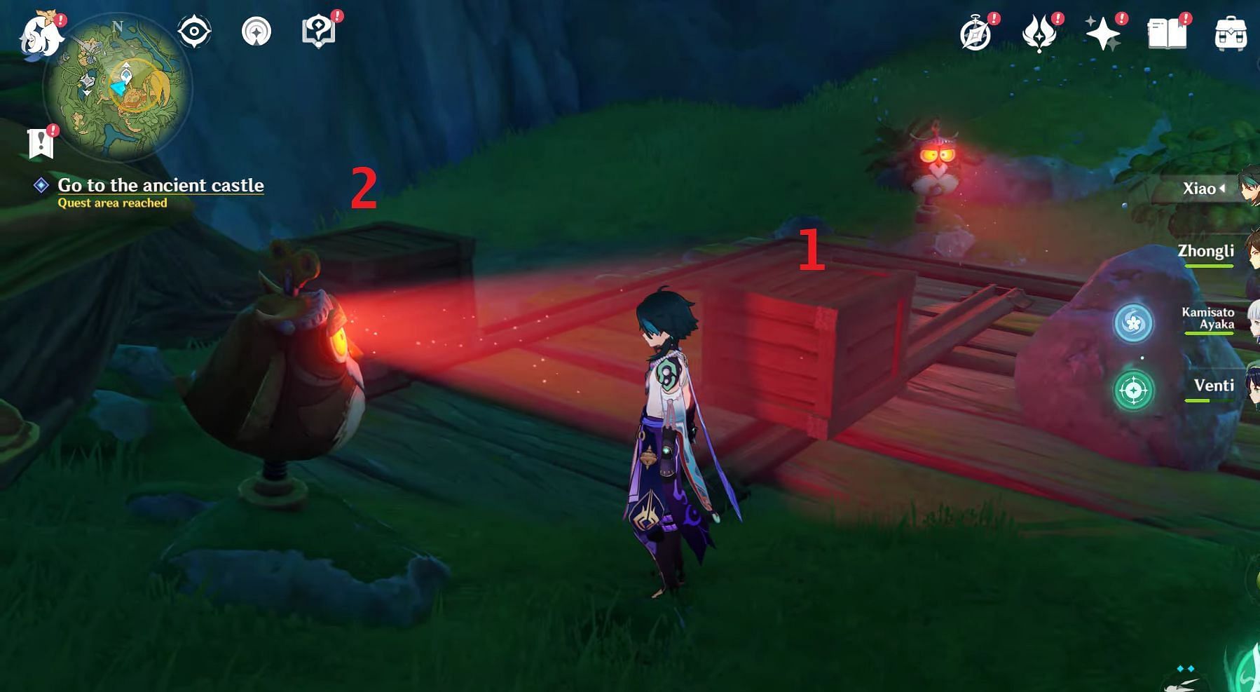 For reference, the above image shows what the puzzle looks like before Genshin Impact players start moving the boxes. There are two Petrifying Gaze owl statues and two boxes. To keep things simple, the Inner Box will be referred to as Box #1 and the Outer Box will be referred to as #2 for the entire article.