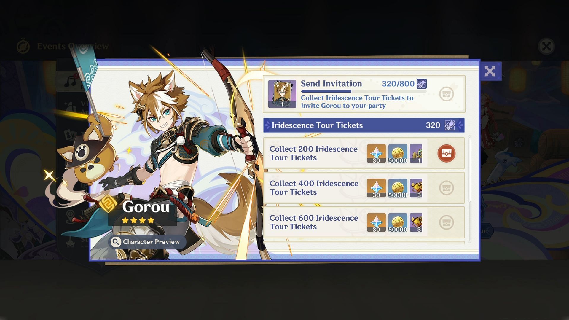 After collecting 200 Iridescence Tour Tickets, you can obtain a new gadget called the Nightwind Horn, which you can use to play music. Luckily, you can hit that mark on the first day of the event. Furthermore, once you've obtained 800 Iridescence Tour Tickets, you will receive one free copy of Gorou, an amazing 4-star Geo support unit in Genshin Impact.