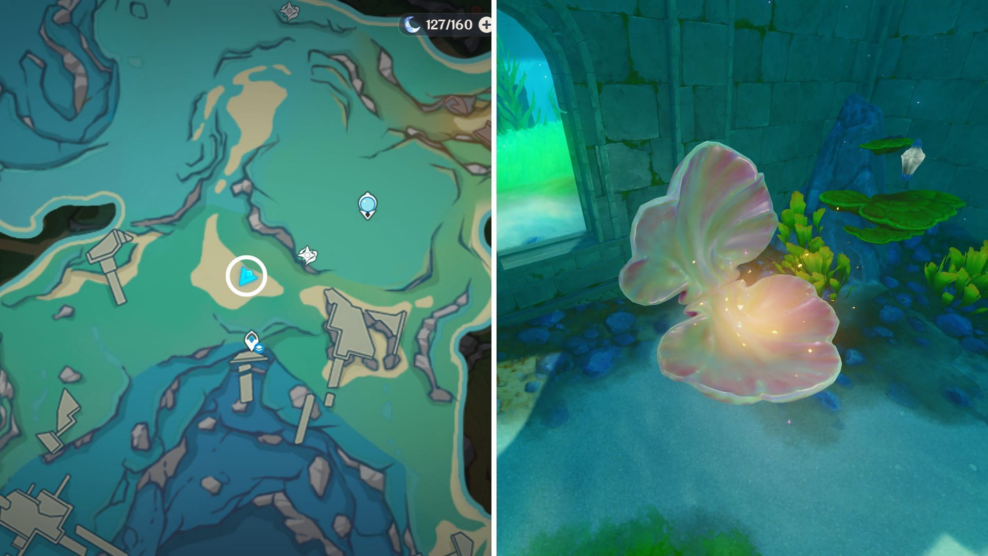 Liam's Ballad treasure map is not that difficult to come across. This map can be found inside a pink clam located north of the Tower of Ipissimus in Genshin Impact. Teleport to Tower of Ipissimus north waypoint and swim until you are close to the water surface and start swimming north. Look for a ruined building and pink clam as you continue to swim in this direction.