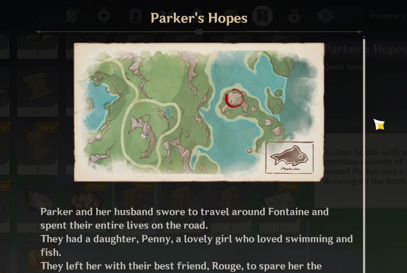Hit the clam once to open it and collect the Parker's Hopes treasure map. Open it in the inventory to look at the clue. It will show you the map of the northeasternmost island in Fontaine. To get there, teleport to the waypoint north of the Lumidouce Harbor and head northeast.