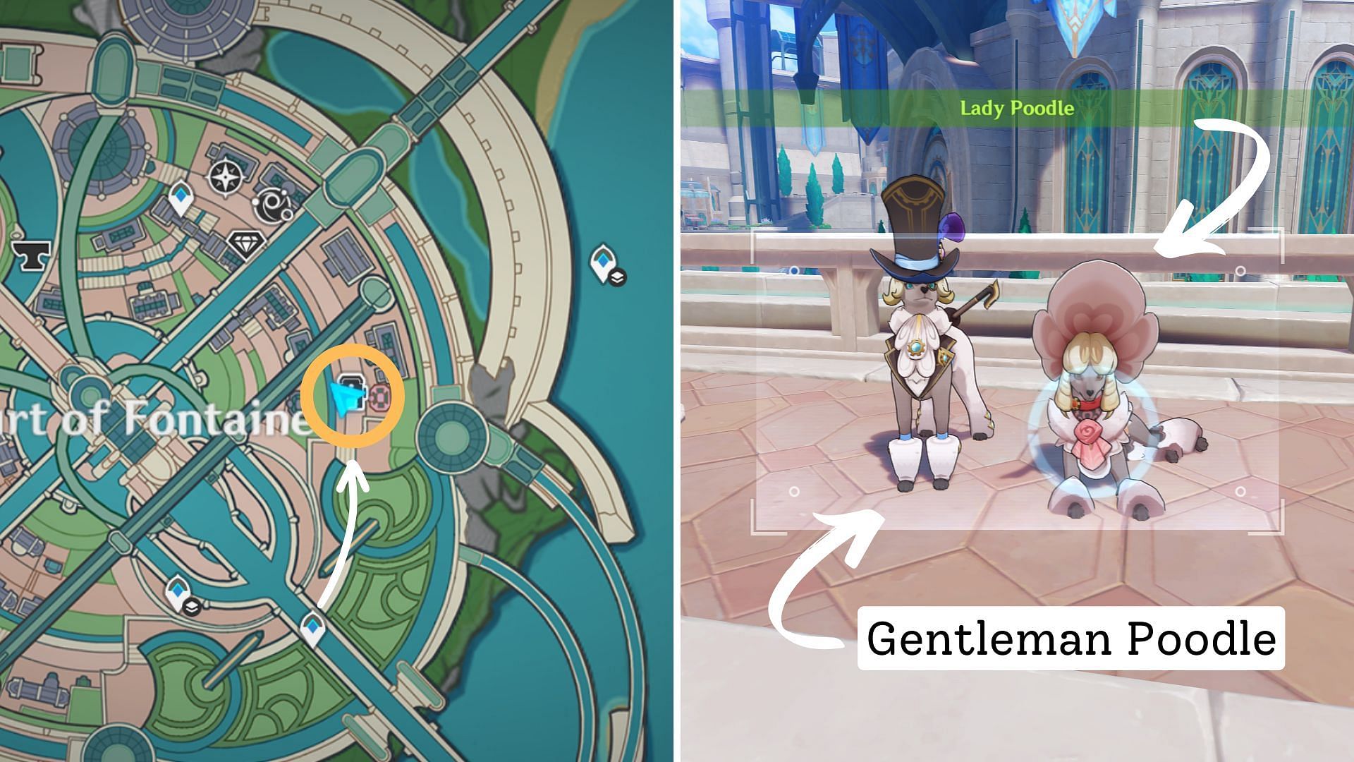 Teleport to the south-east waypoint and keep following the road going north. Keep moving forward until you enter Fontaine's shopping district and find two more poodles (Gentleman Poodle and Lady Poodle) sitting in front of a clothing store.