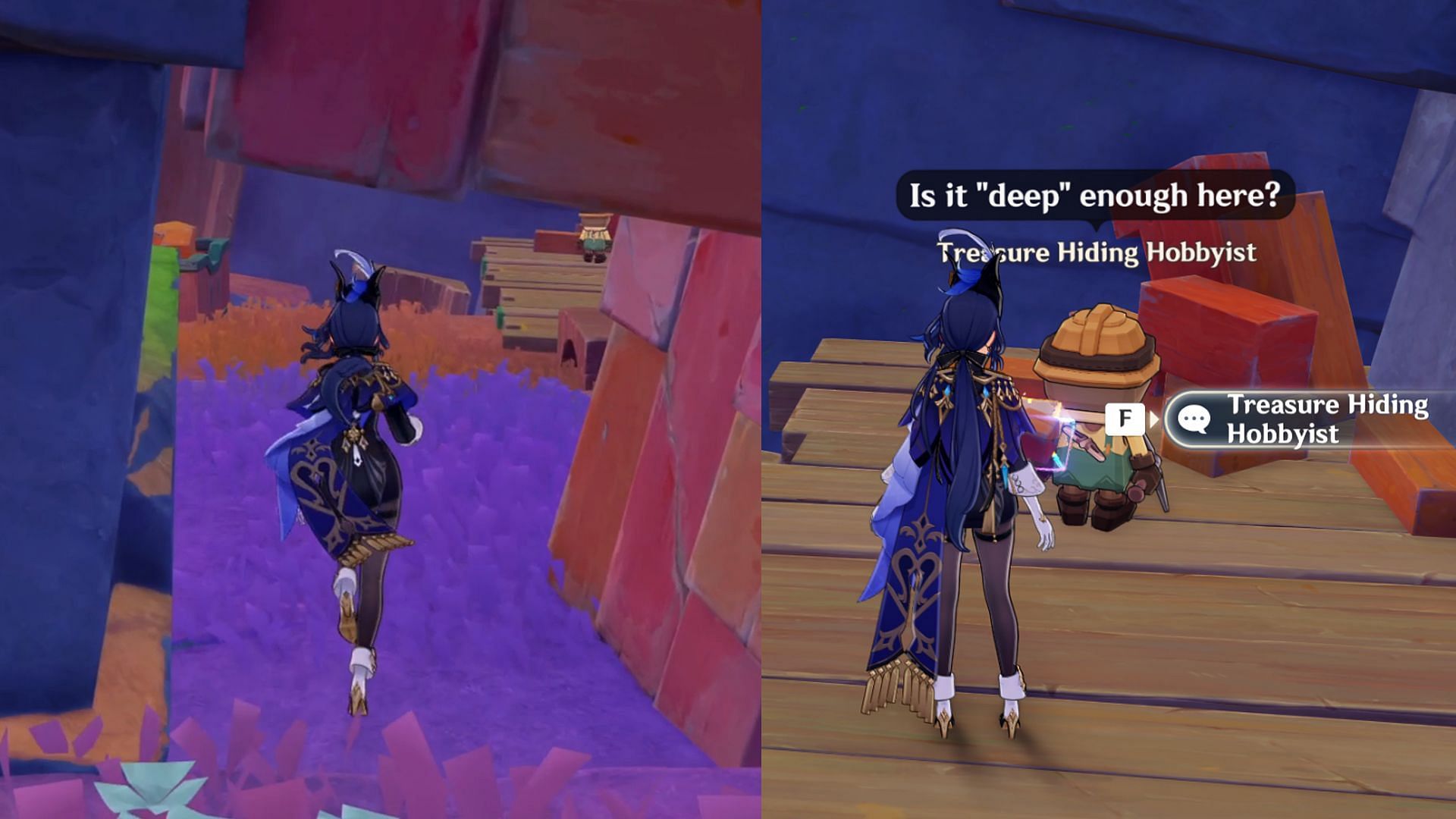 After interacting with the Treasure Hiding Hobbyist, take two steps forward and a "Dig" option will pop up. Click on it, and you will get a Mora Chest with a reward of 15,000 Mora.