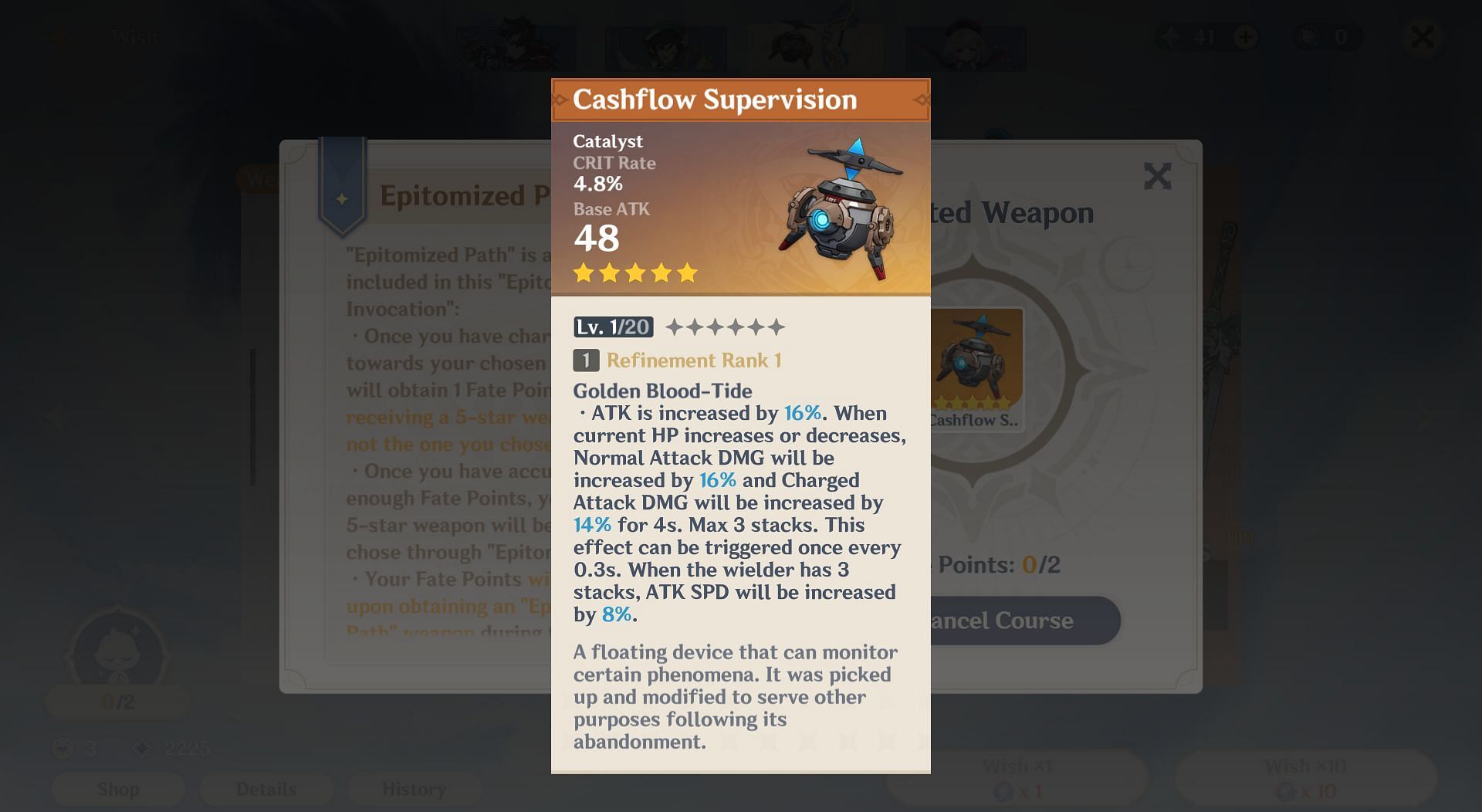The Cashflow Supervision is Wriothesley's signature weapon and will always be his best in the slot. It has a pretty high Base ATK of 674 and provides a decent amount of CRIT Rate sub-stat. Furthermore, it imbues a ton of ATK% along with Normal and Charged Attack DMG bonuses from the passives. It is a highly recommended weapon for any player who can whale.