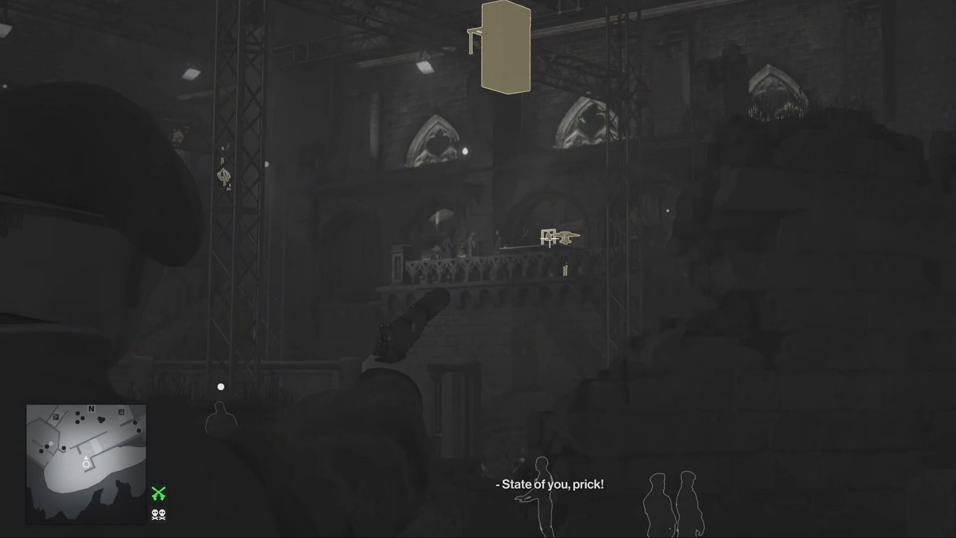 It can be shot from ground level from the corridor area using the silenced pistol. For precise aiming, it is best to use 47's Instinct Vision. A successful execution will cause The Disruptor and Quinn to part ways. The next step is to replace Quinn, allowing Agent 47 to take on The Disruptor himself.