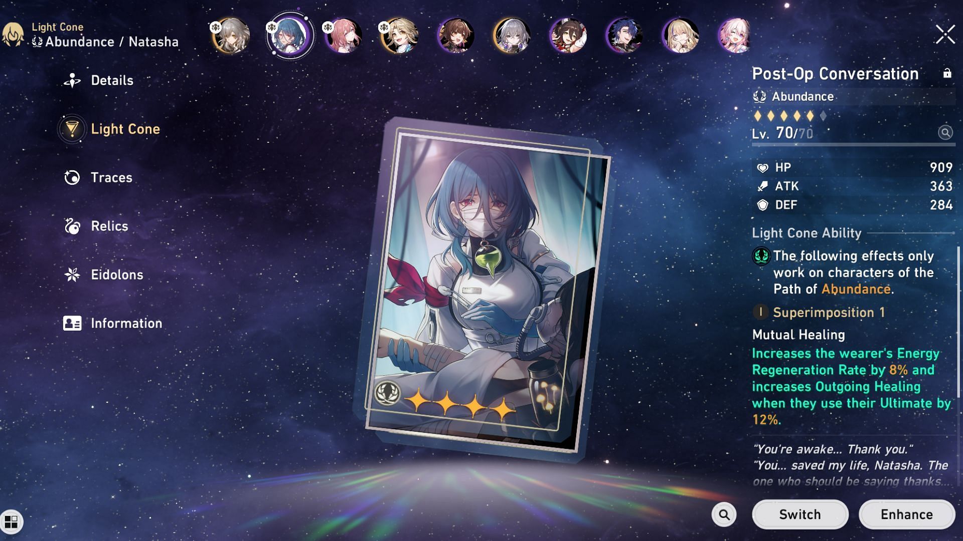 Luocha has plenty of 4-star Light Cone options to cater to healing abilities. Hence, we advise you to avoid his signature option, Echoes of the Coffin, due to its niche use cases. Instead, build him with the Post-Op conversation, as its passive provides energy and a healing bonus to the wearer.