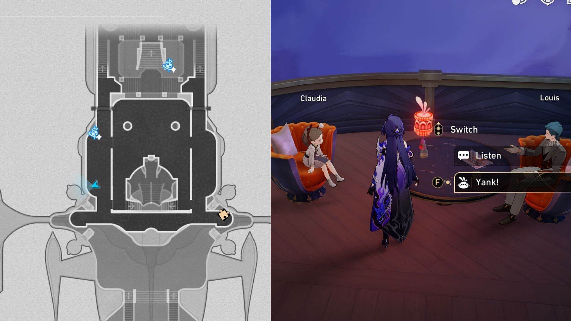 Pass through the western exit and take a few steps to the south. You will locate Claudia and Louis, along with the bird on the table.