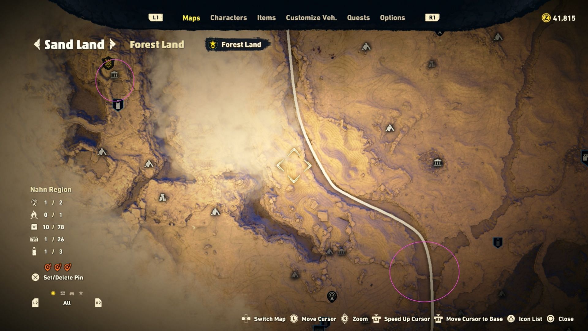 This section of the map is cordoned off by a massive canyon, which is replaced by a river later in the story. So you’ll want to ride along the edge of this area until you find the bridge across, which has also been circled.