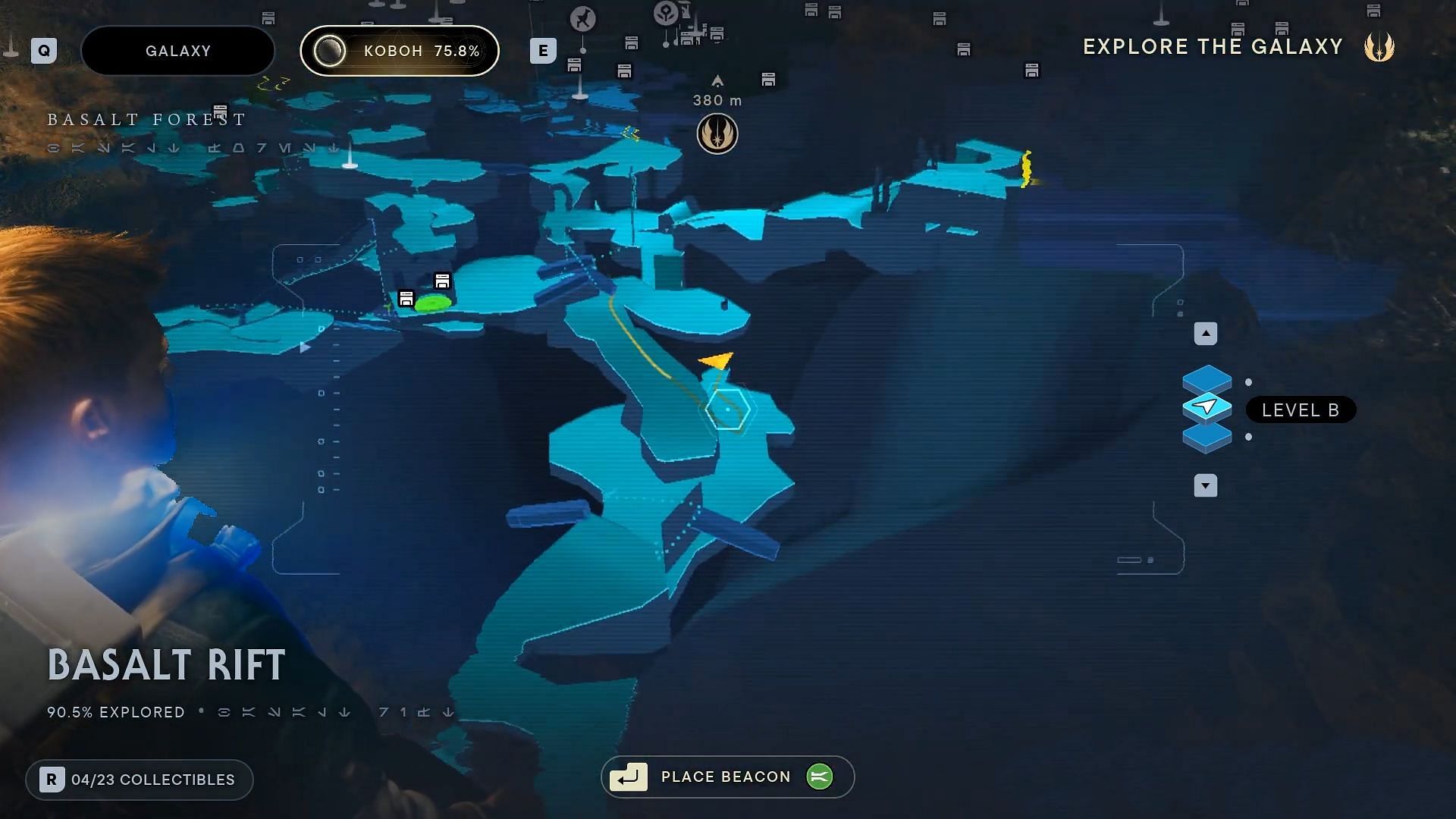 Navigate to the Basalt Rift on Koboh and go to the Meditation point. Travel beyond the arches and away from the Stormtroopers to the bottom level on the map. Take the path towards the left just beside Sleeping Bilemaw and enter the cave present on the right. The Chest will be present inside it.