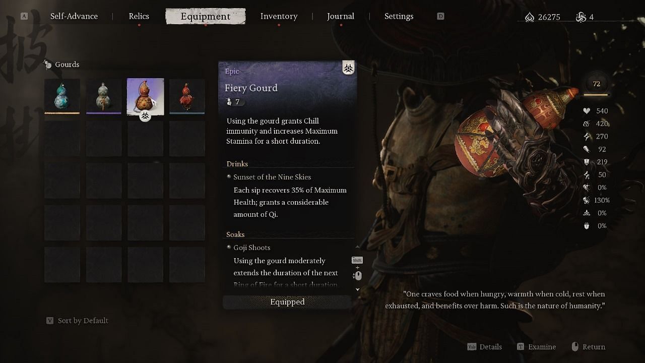 Once in the inventory, the Fiery Gourd can be used seven times on Sun Wukong. Upon usage, the protagonist is granted Chill immunity, and his maximum Stamina is increased for a short period. The item's description reads as: