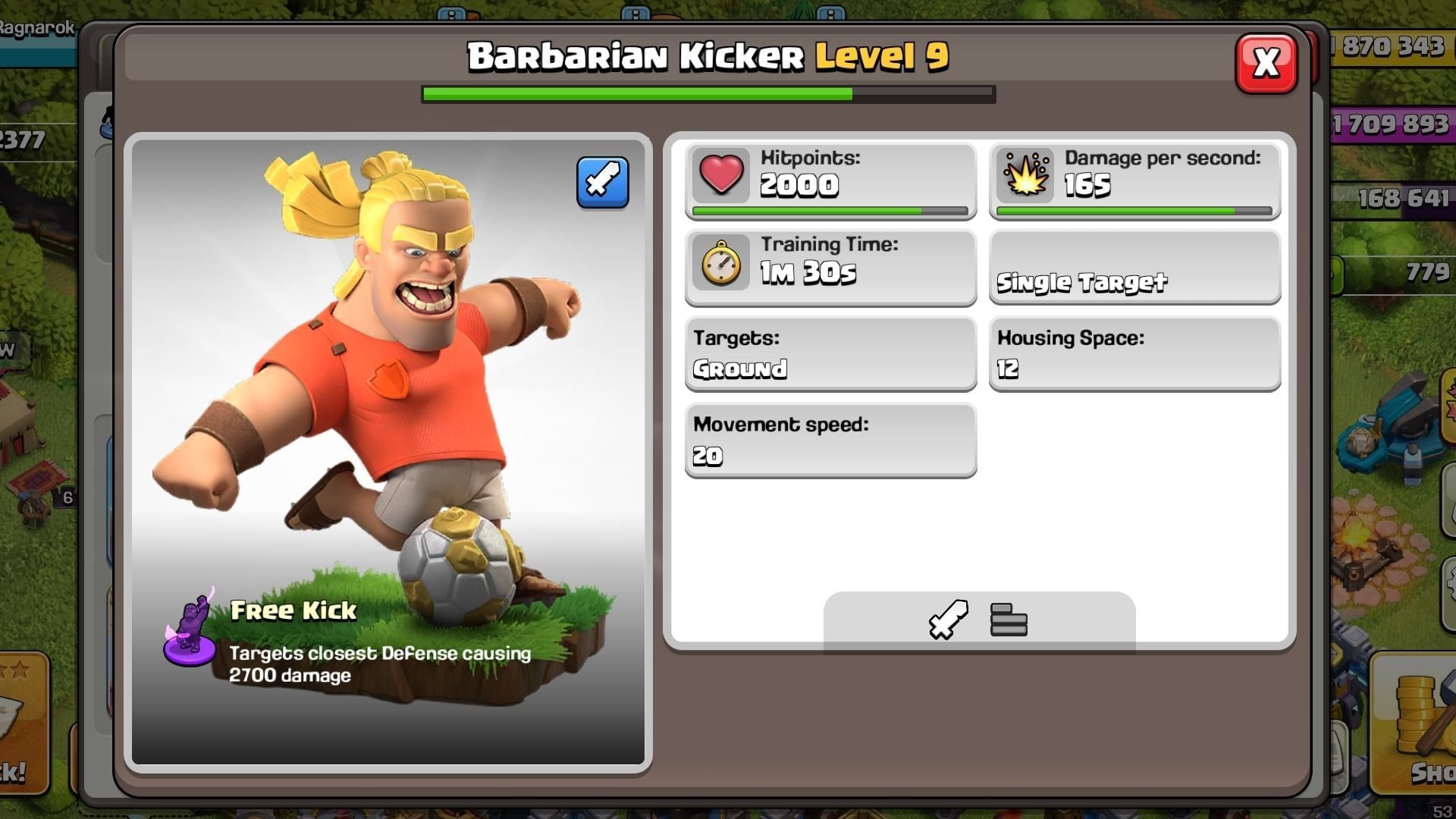 Barbarian Kicker in Clash of Clans is skilled with a Free Kick ability that, for his first assault after being deployed, allows him to attack the closest defense building with a football, dealing 2,700 damage. It has been released for all players with Town Hall levels above three. The troop comes with only one disadvantage: low housing space, making it prone to the Spring Traps.