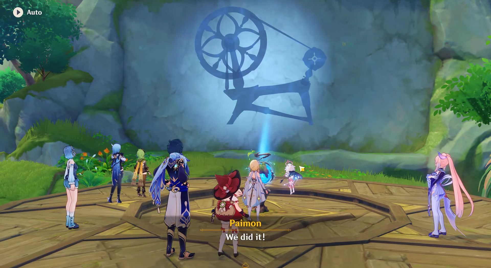 After inserting all the items in their respective slots, the final preprint projection should look similar to what is shown in the above image. Solving the puzzle will trigger a long cutscene, leading to Idyia revealing her true identity to everyone present around her, dropping some well-needed lores, and concluding the long summer event quest.