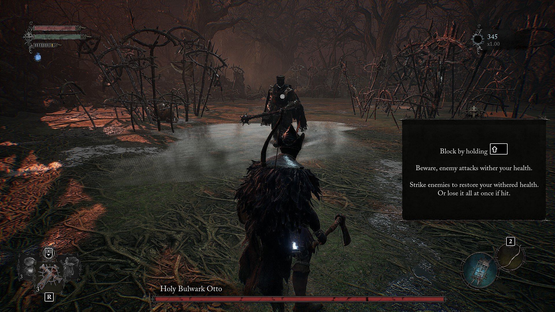 Right after you exit the cave where the game teaches you the ropes of combat, realm traversal, puzzle solving, and general gameplay system, you face your first boss - Holy Bulwark Otto. Unsurprisingly, being the very first boss in the game, Otto is quite easy to deal with. It can be defeated with just a few charged heavy attacks and parries.