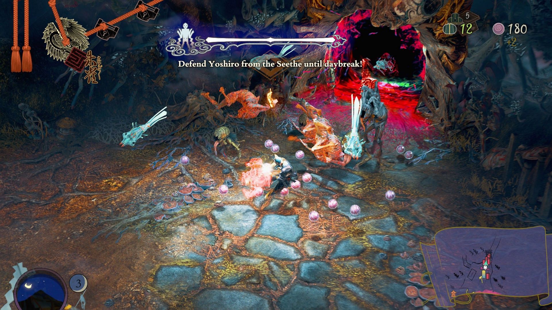 When night falls, however, danger rears its head. The Seethe begin to emerge from a twisted rendition of the Torii Gate and move toward Yoshiro like a moth attracted to a flame - and it is up to Soh and his fellow Villagers to keep the fair Maiden safe by defeating the threat before they can get to her. While things start relatively easy, Kunitsu-Gami Path of the Goddess is not shy to ramp up the challenge halfway through.