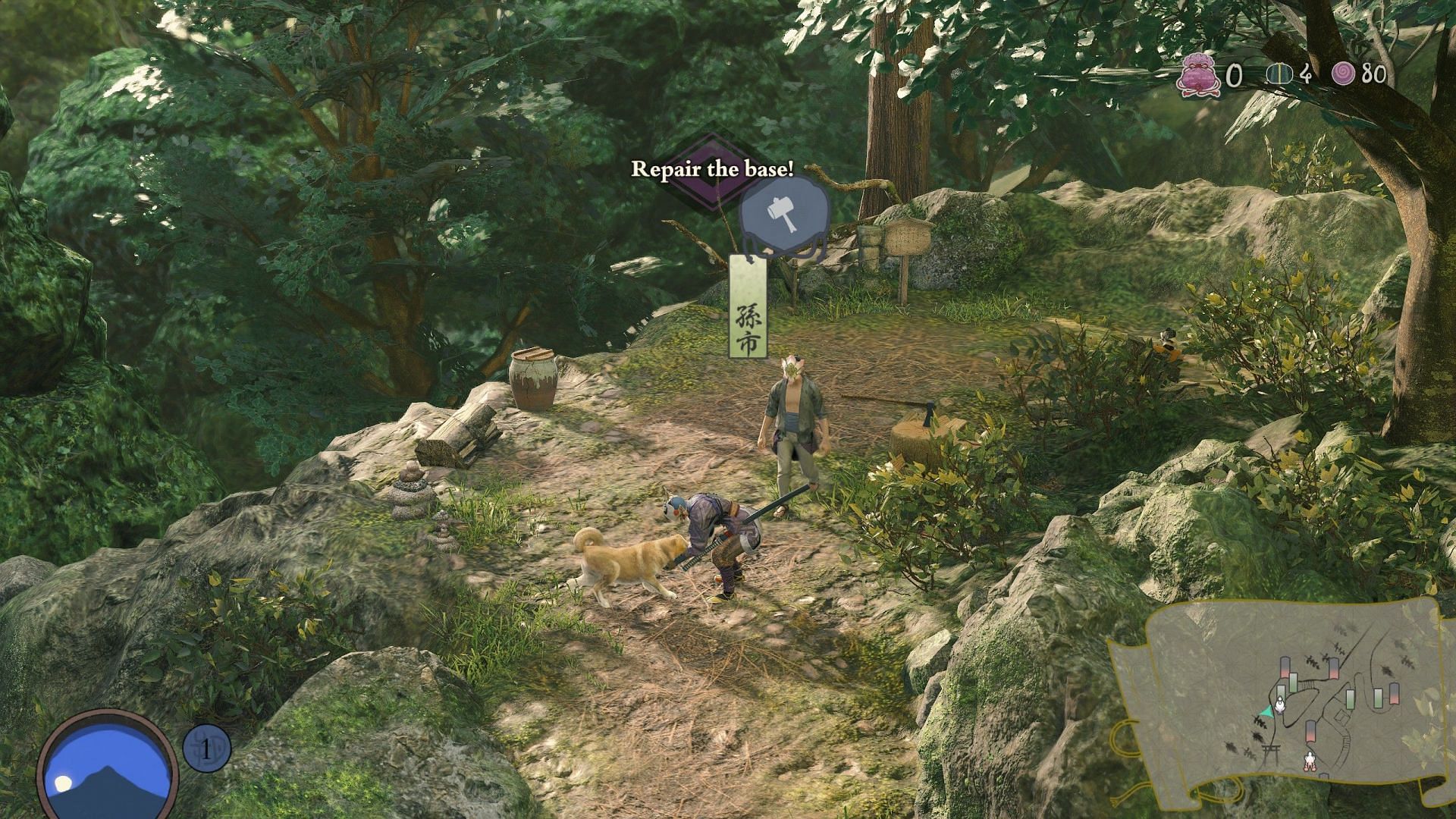 The base is also where Yoshiro sets up her Tent, which you can interact with to save the game, upgrade Soh and his allies, and just spend time with Yoshiro. After all, there is a richly detailed rendition of her sitting across the table, idling as you, the player, fiddle around with menus and upgrades.
