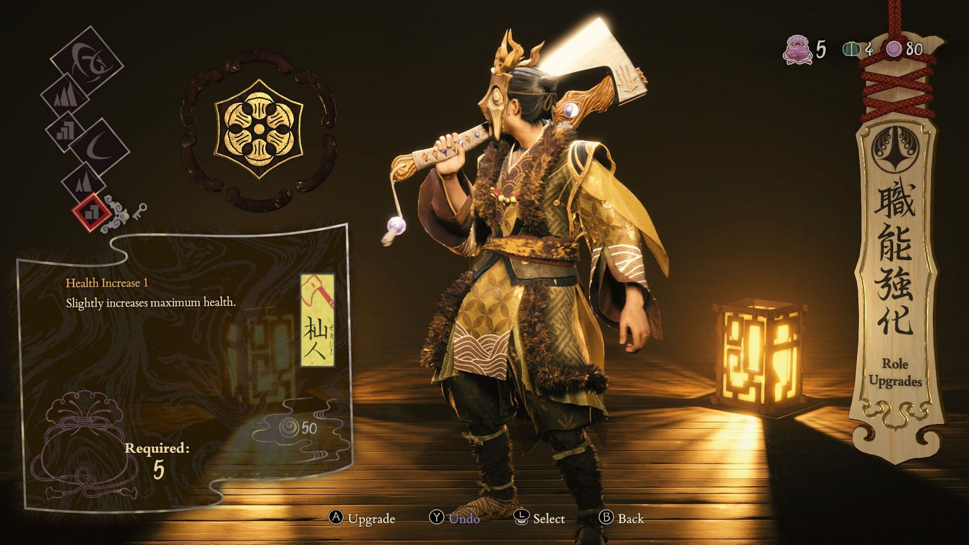 These are Tsuba Guards and Mazo Talismans that grant a unique power to use in battle and passive perks, respectively. The former consists of abilities like setting up mines, buffing Villagers, or casting a dome barrier over an area, while the latter includes bonuses like extra health, damage, and so on.