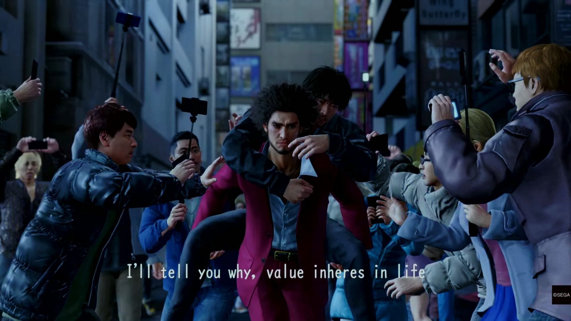 It was a sad scene, where citizens of Ijincho threw bottles and other garbage at the two of them. Even when a citizen repeatedly punched Kasuga in the face during the Like a Dragon Infinite Wealth ending, he stoically took the beating to protect Eiji. A soothing song began to play during this time, which was also cut with scenes of a helicopter coming to pick up Kiryu from the Millenium Tower.
