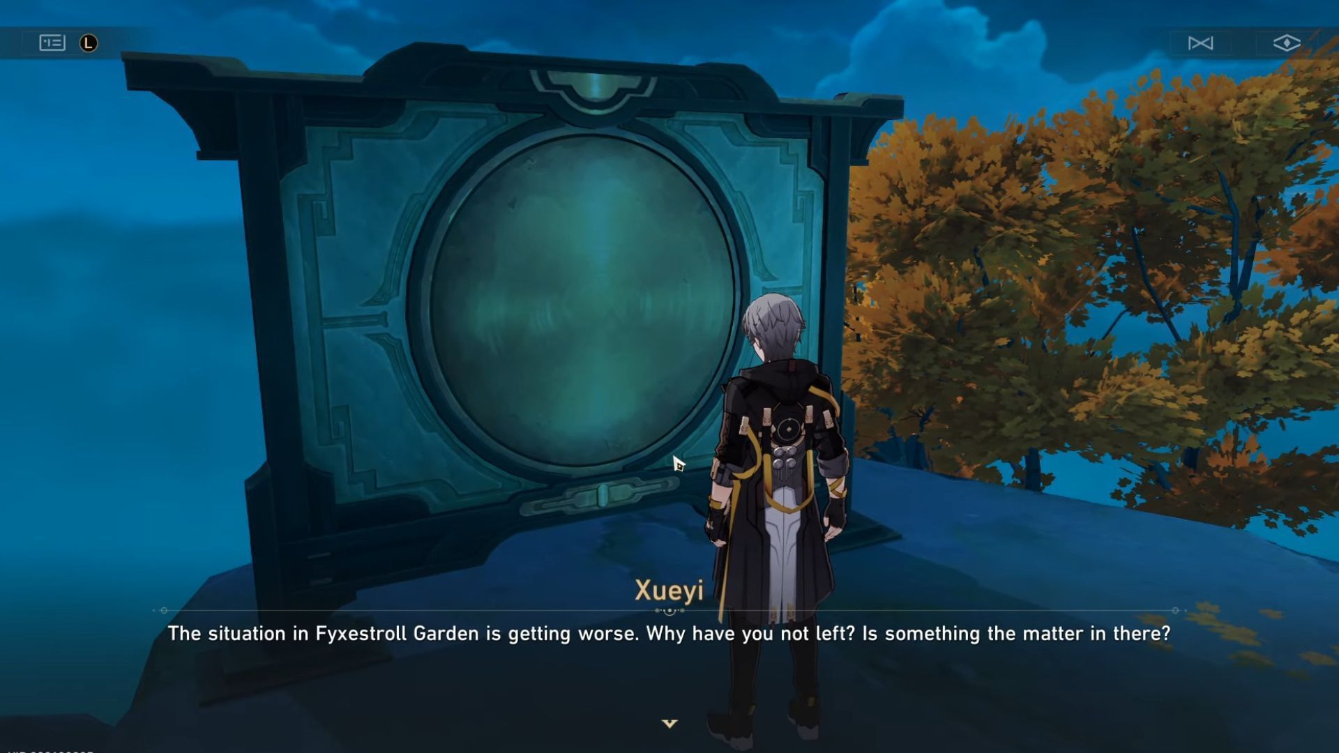 The correct Xuyei dialogue for this puzzle will begin with, “The situation in Fyxestroll Garden is getting worse.”