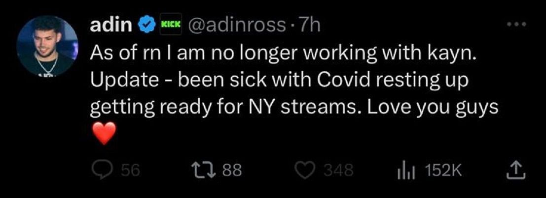 "As of rn (right now) I am no longer working with Kayn. Update - been sick with COVID resting up getting ready for NY (New York) streams. Love you guys."