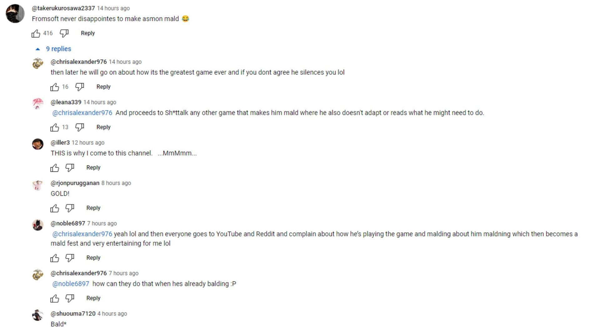 Other commenters were enjoying the frustration of the streamer. They were glad that, once again, a FromSoft game wound up making Zack angry in such a manner. Some enjoyed watching others become upset at how the streamer played the game, finding a sense of Schadenfreude - or pleasure in someone else’s misfortune - in the whole affair.