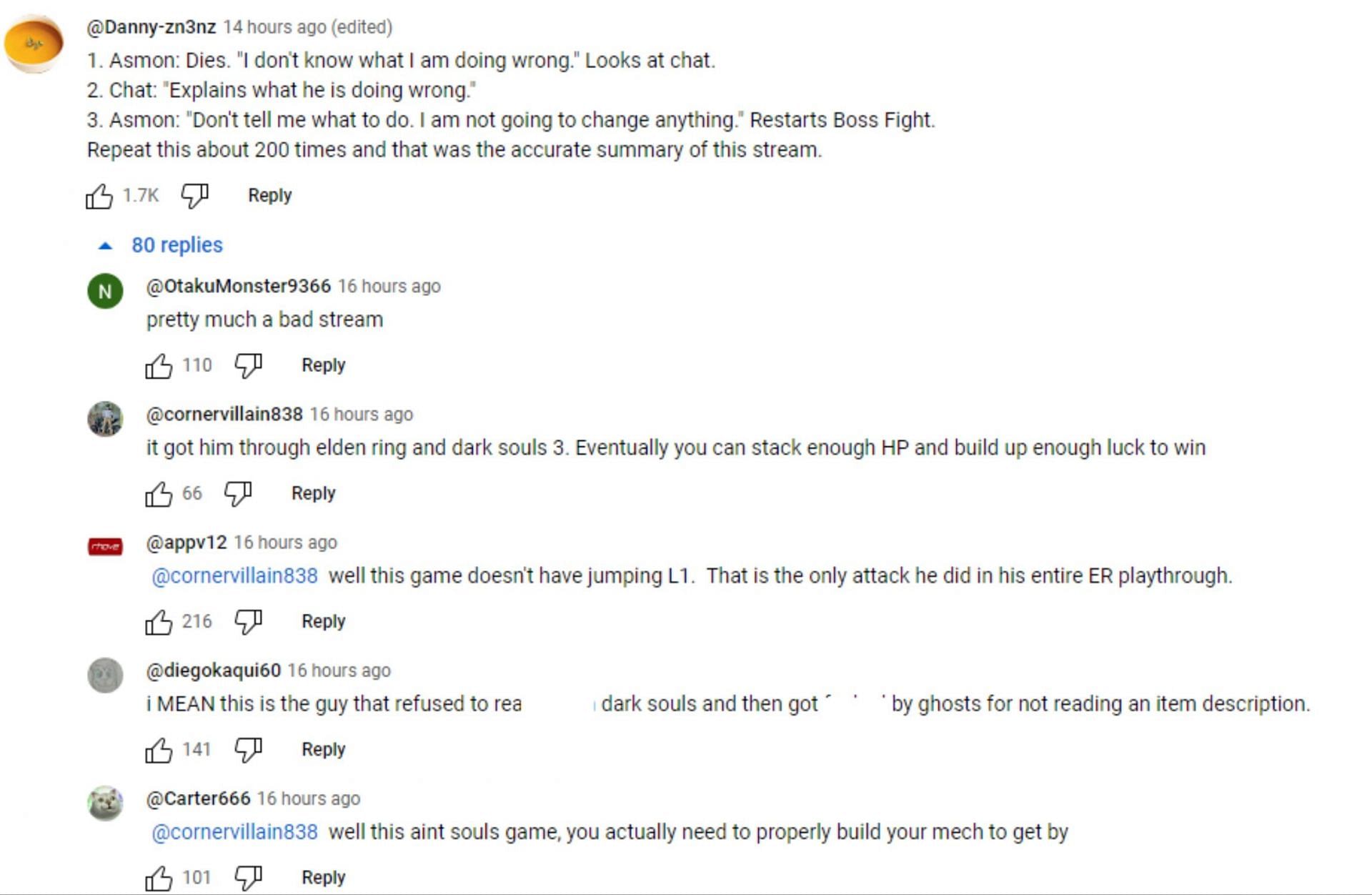 The comments on Asmongold’s YouTube account were not kind to the streamer. They pointed out that despite saying he wanted to figure it out on his own, he kept doing the same thing that wasn’t working. They would highlight Zack’s experiences in the Dark Souls games, saying that sort of thing doesn’t work in Armored Core 6.