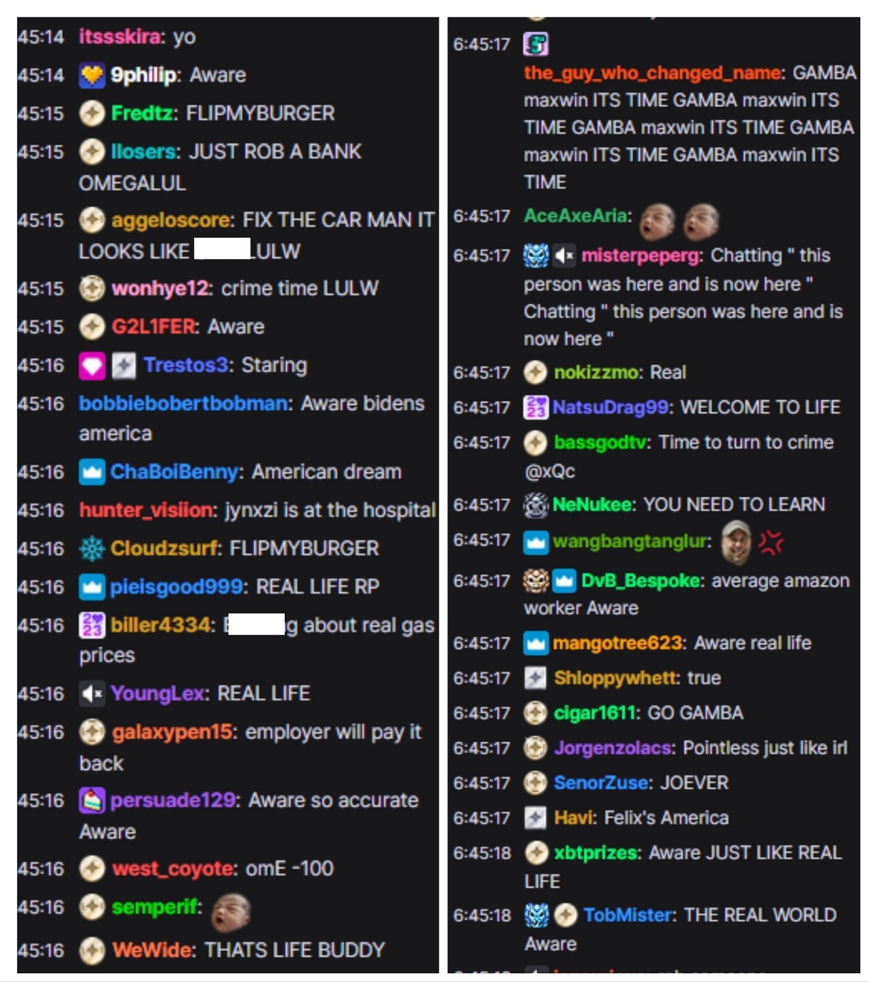 Several users spammed “AWARE” while many more would say it’s just like real life. There was a wealth of responses, but many of them were focused on how accurate it is compared to the real world. As one of the users in xQc’s chat, IttzFloofy said: