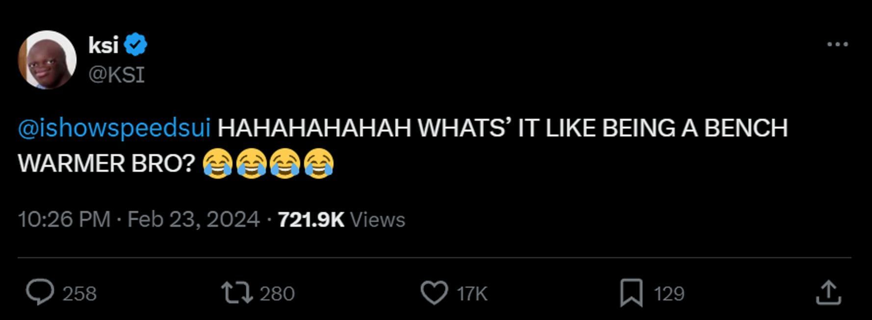 "What's it like being a bench warmer?" - KSI banters with IShowSpeed after not being selected to start the charity match