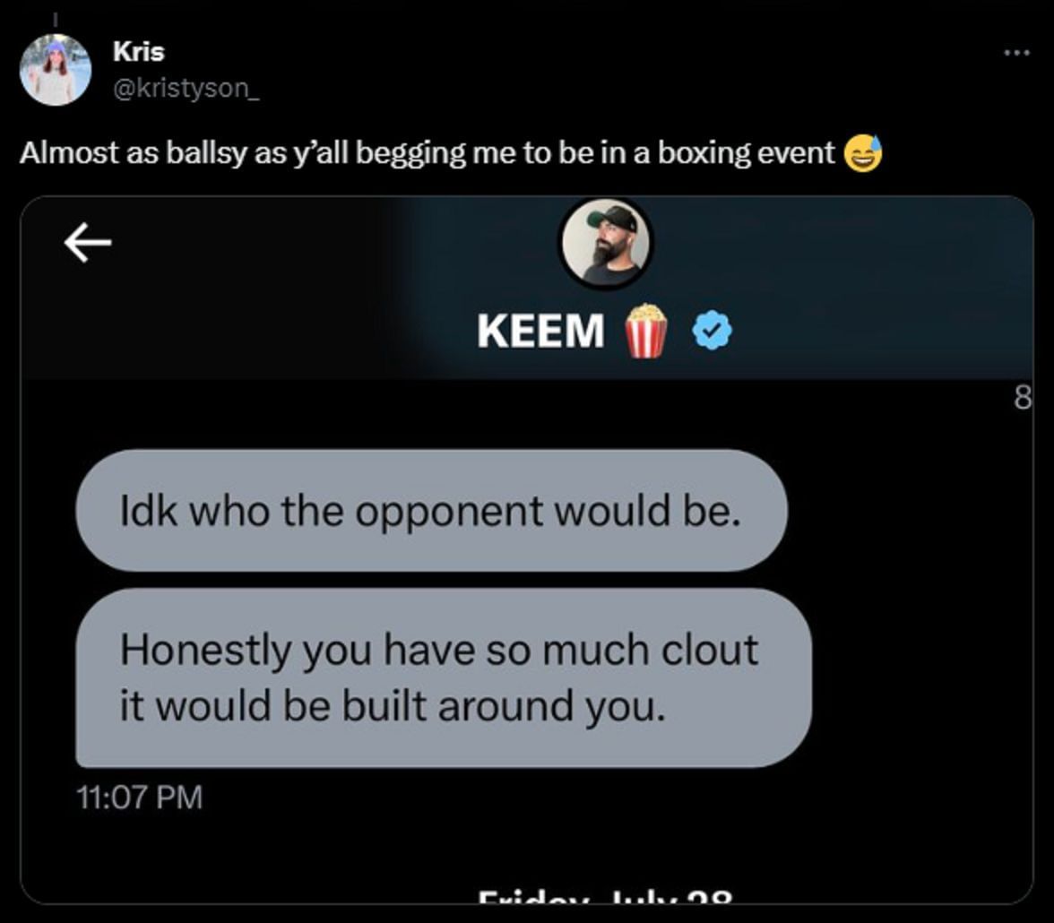 After the troll post, Kris Tyson shared another surprising update. She posted a screenshot revealing Keemstar, the controversial creator, reaching out to her through private messages to extend an invitation for a boxing match. Here's what he sent: