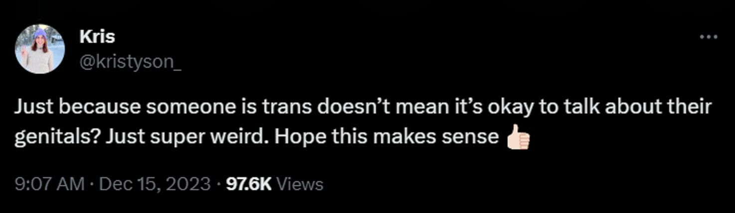 "Just because someone is trans doesn’t mean it’s okay to talk about their genitals? Just super weird. Hope this makes sense."
