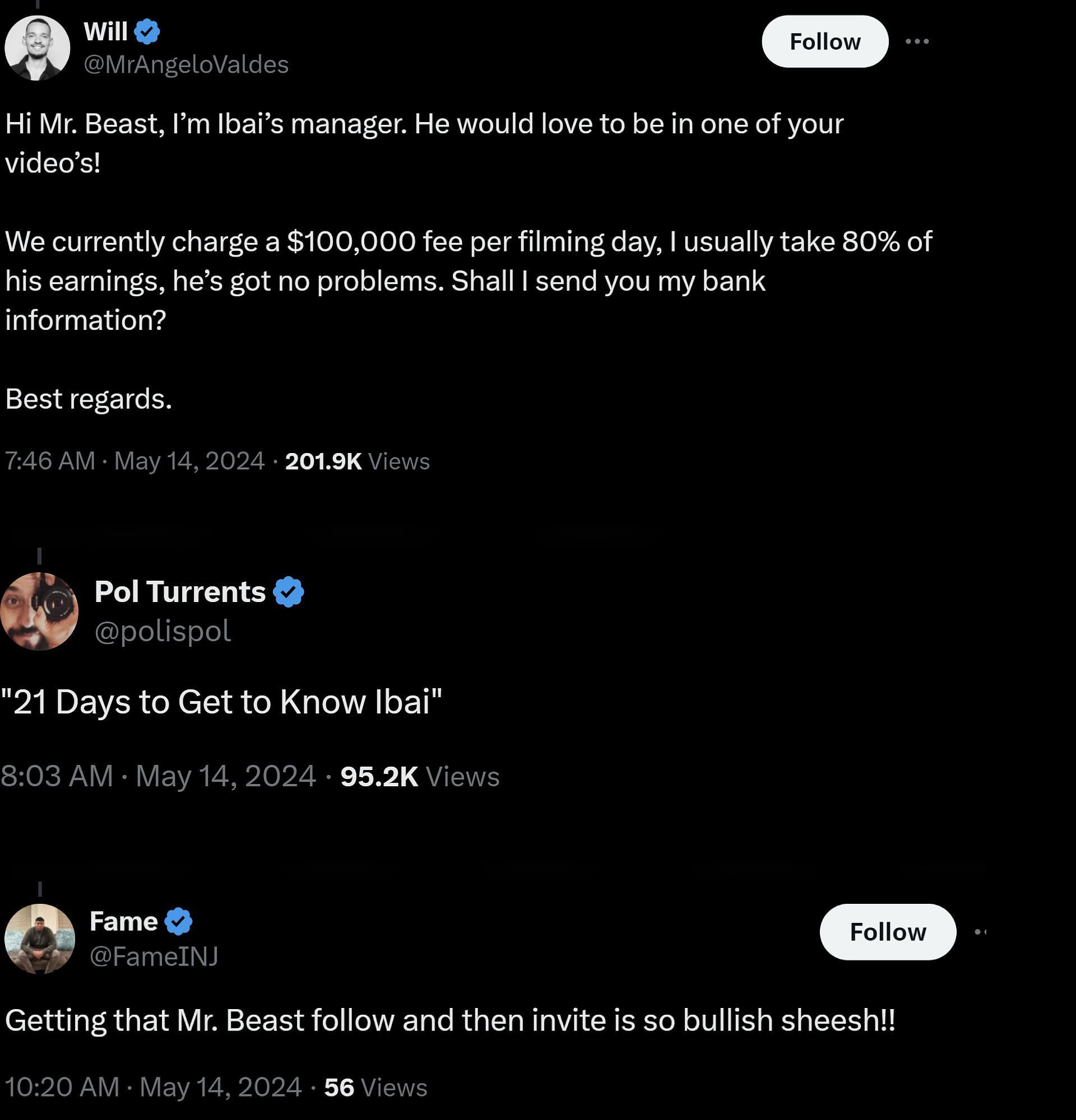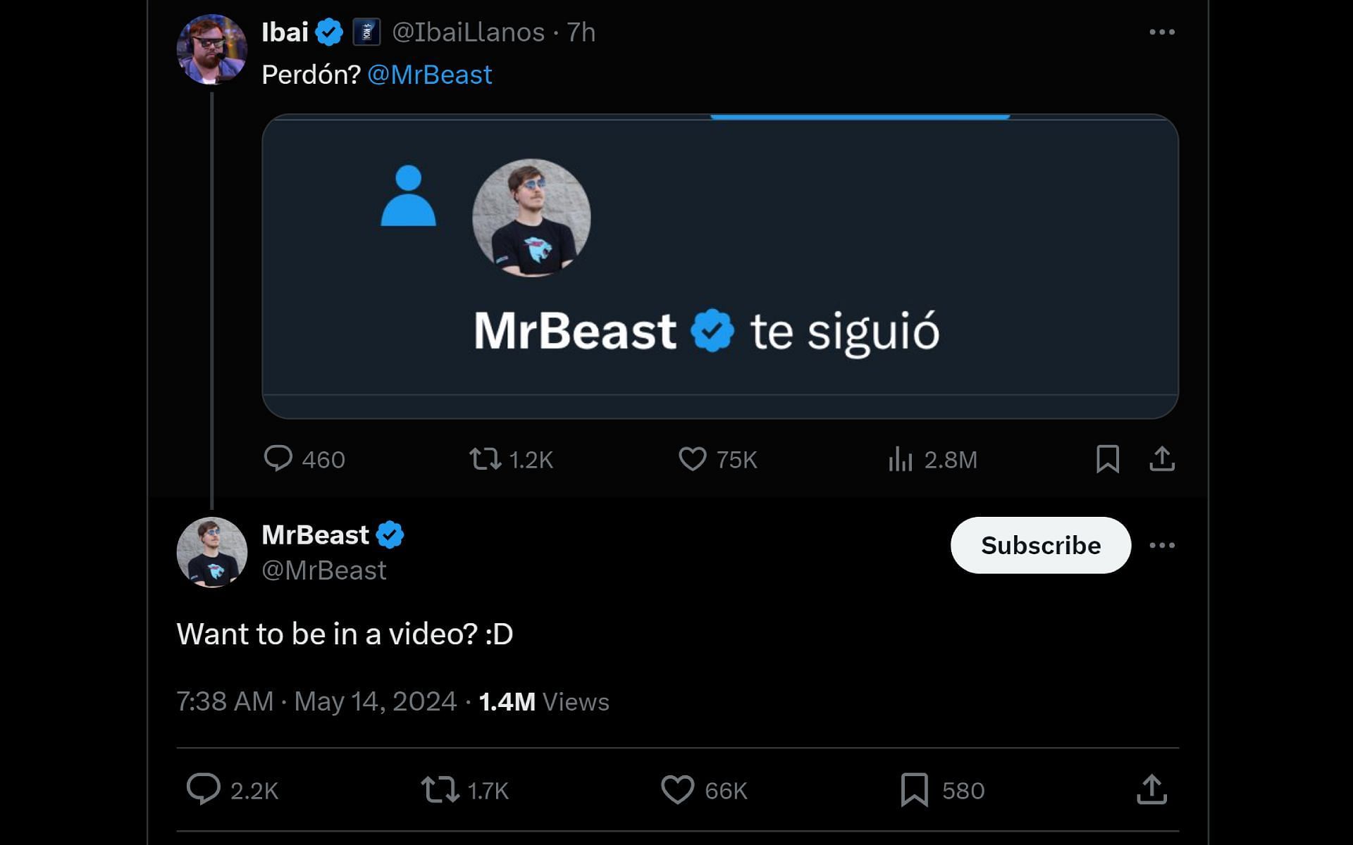 On May 14, 2024, MrBeast went viral once again after Twitch streamer Ibai disclosed that he had followed him on X. The former's response, in which he asked the Spaniard if he wanted to team up for a video, garnered over 1.5 million impressions and more than 68,000 likes.