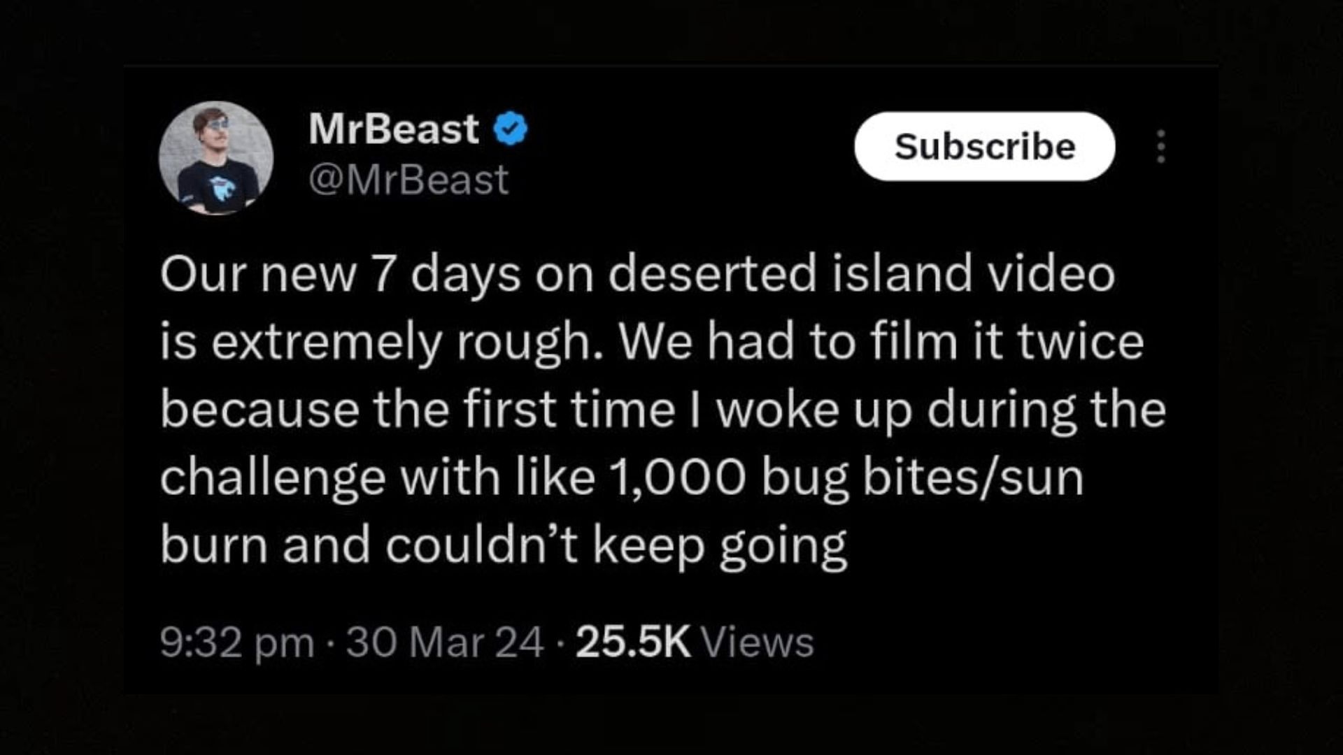 "Our new 7 days on deserted island video is extremely rough. We had to film it twice because the first time I woke up during the challenge with like 1,000 bug bites/sun burn and couldn’t keep going"