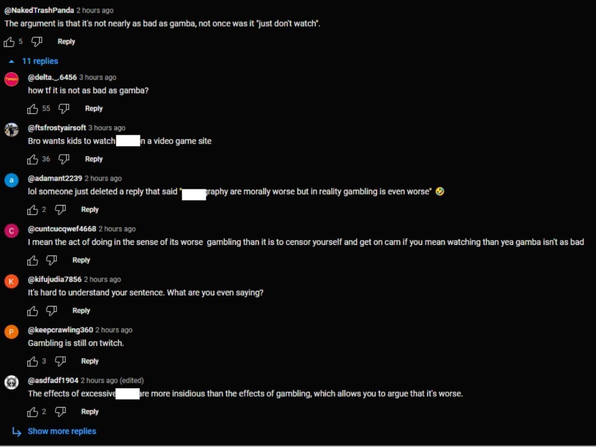 Much of the discussion on the streamer’s YouTube clip focused on the argument itself. One netizen pointed out that the argument is that the NSFW meta isn’t as dangerous as the Gambling meta, and people aren’t saying, “Just don’t watch”. This led to people debating which is truly worse on the platform.
