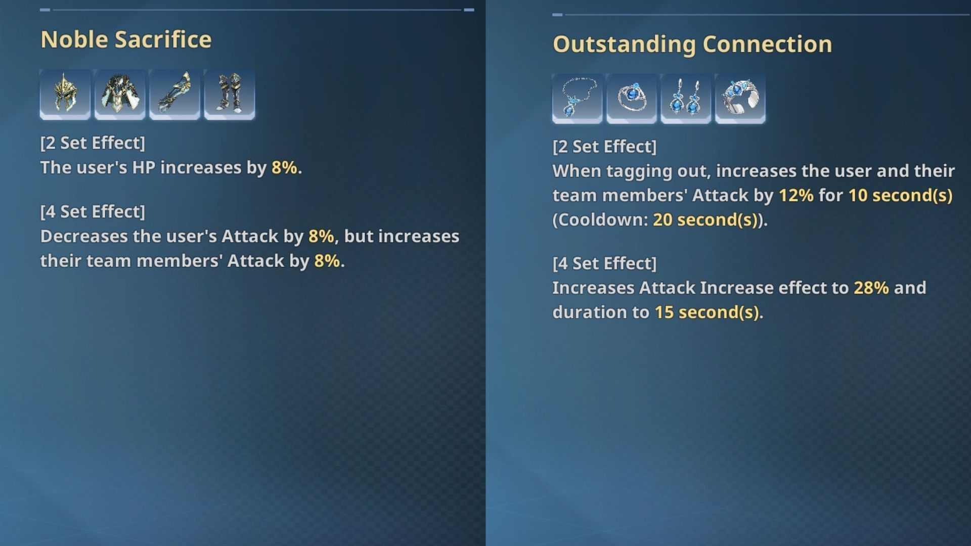 - Outstanding Connection: The bonus effect of this accessory triggers when Yoo tags out from the battlefield. With two pieces equipped, he and all his teammates' attack increase by 12% for ten seconds (cool down in 20 seconds). Its 4-set effect bonus increases the attack buff percentage to 28% and the duration to 15 seconds.