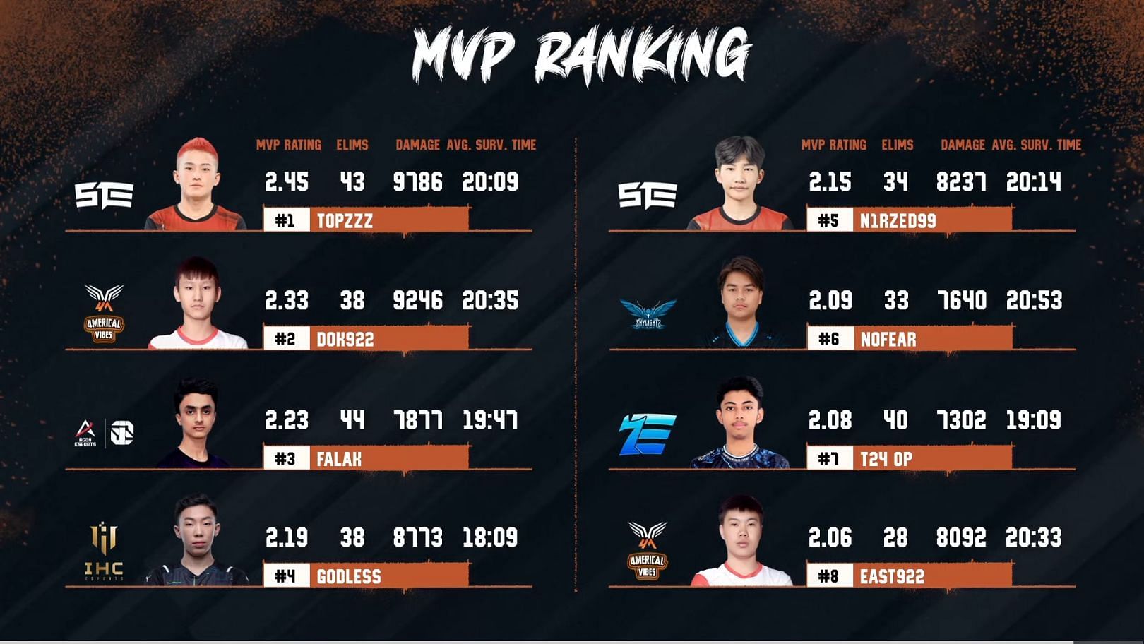 Raw Esports, a team that showed great promise in the last few weeks, struggled to maintain their momentum during this event's last stage, earning them in a seventh-place finish. Fan-favorite team Skylightz Gaming's inconsistent performance led them the ninth place.