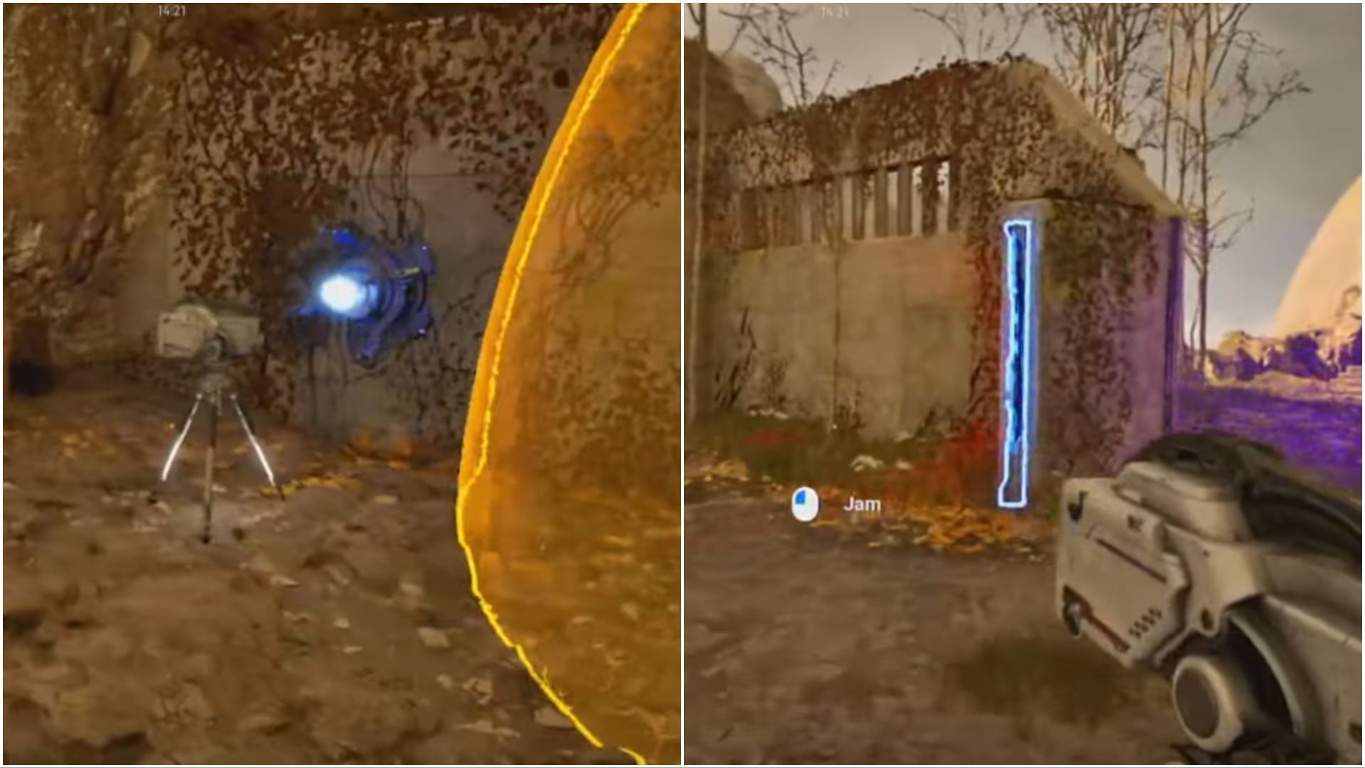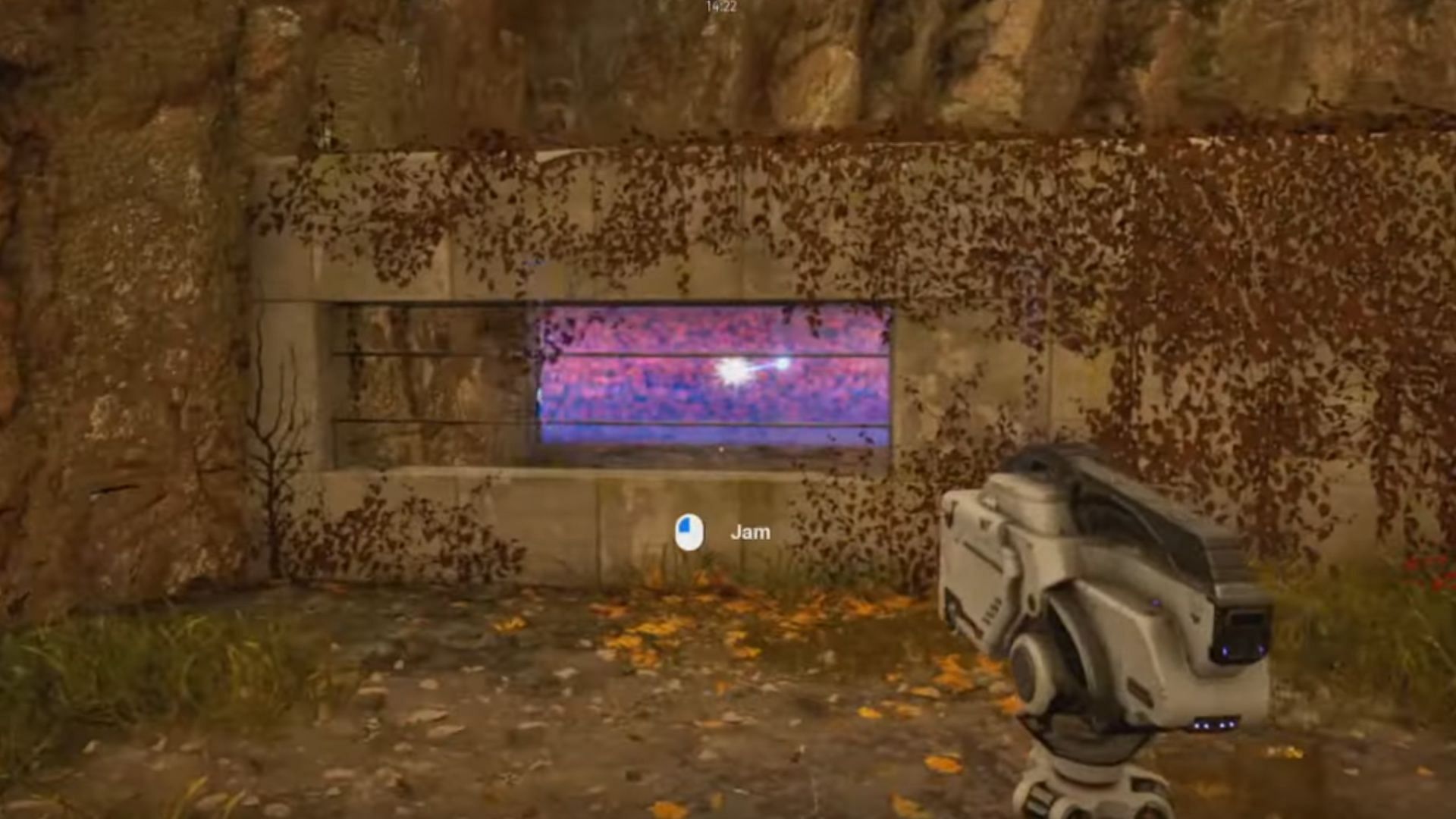 Proceed beyond the wall and turn around. You will encounter another device. It is basically a jammer linked to a blue switch. Pick up the jammer and position it on the ground nearby.