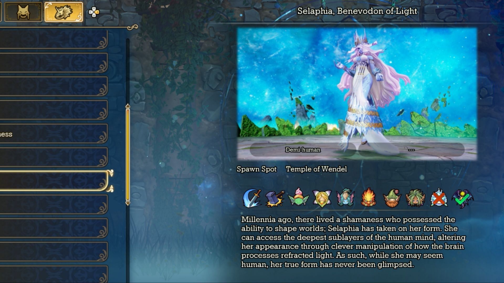 Selaphia is a Level 31 Demi-human boss in Visions of Mana. Found while chasing down Daeolophos, the antagonist frees her, and leaves, forcing you to clean up his mess. Selaphia is weak to Darkness Magic, and Immune to Light Magic. If you have access to Light Shield and Dark Saber, these are fantastic times to pull these both out and cast them on your party.