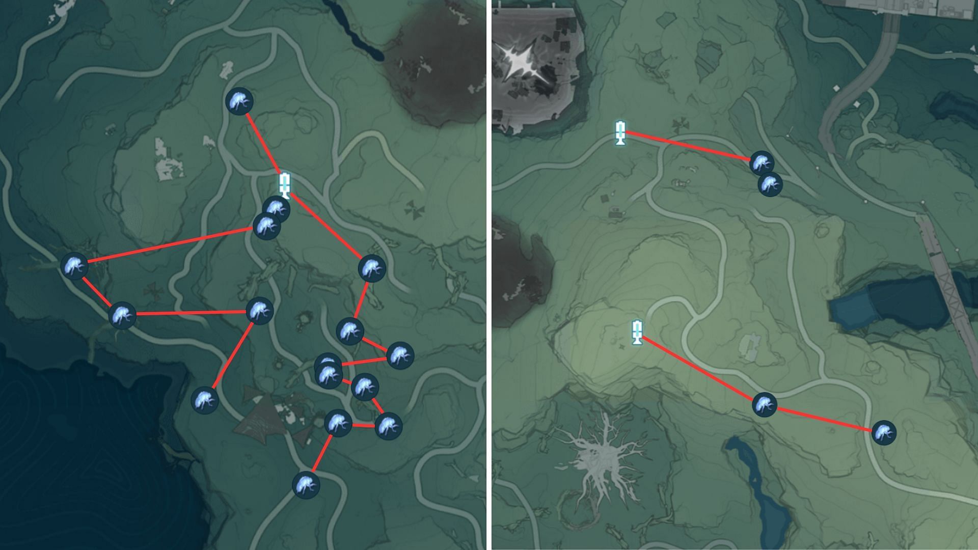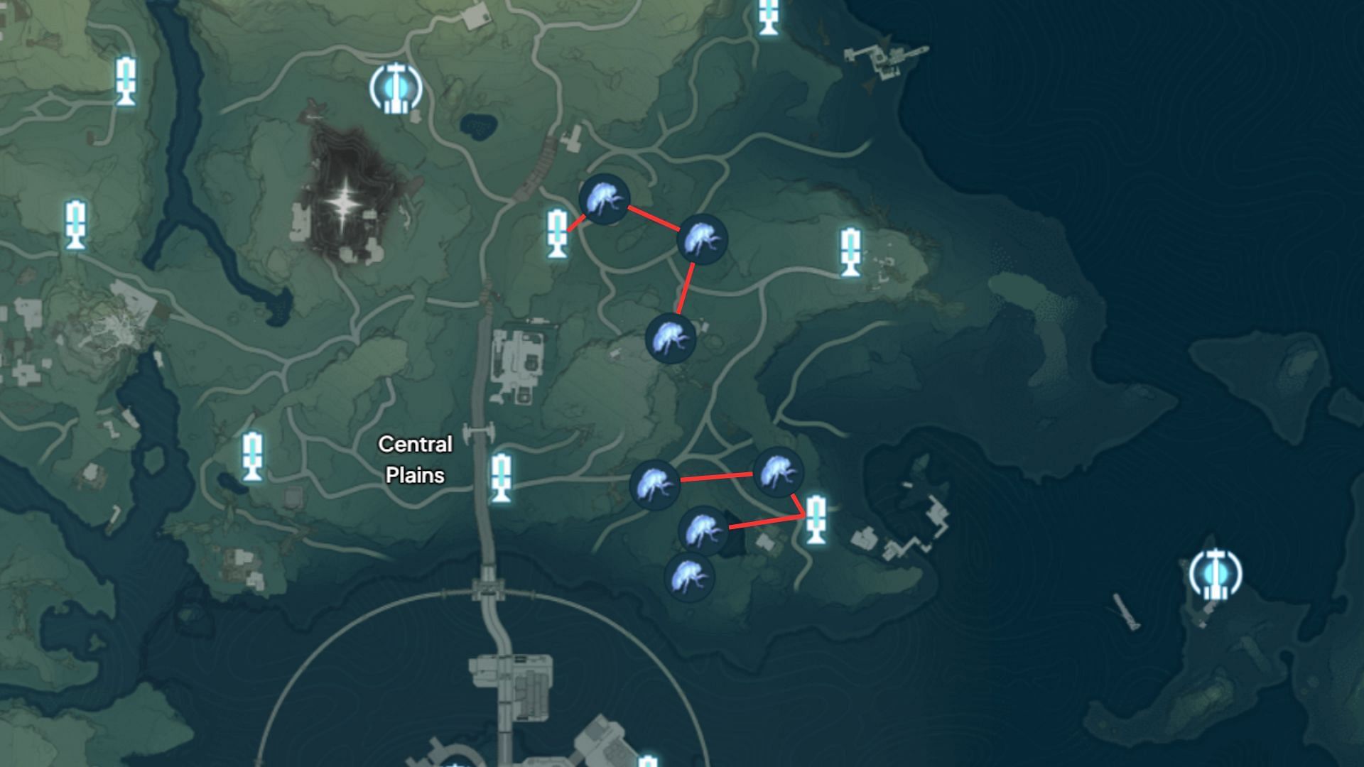 As previously mentioned, certain areas have a high concentration of this in-game resource, making it ideal for farming. Make sure you have unlocked all resonance beacons beforehand to easily travel across the map. Given below are some of the best routes for Gloom Slough farming.